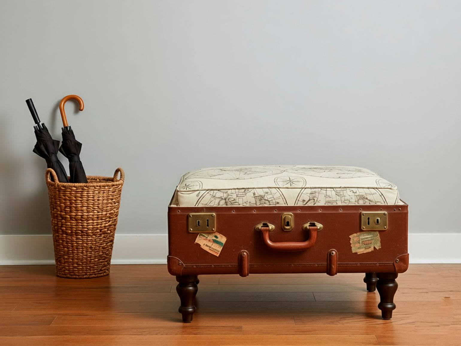 - Банкетка в прихожую из старого чемодана. Ножки можно взять от старого табурета или тумбочки, вместо сиденья — мягкая подушка.