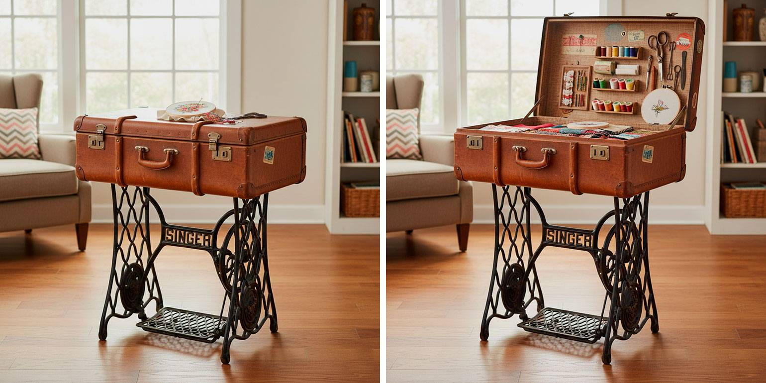 - Оригинальный столик для рукоделия тоже сделать несложно. В качестве столешницы используем тот же чемодан, а роль ножек играет станина от швейной машинки.
