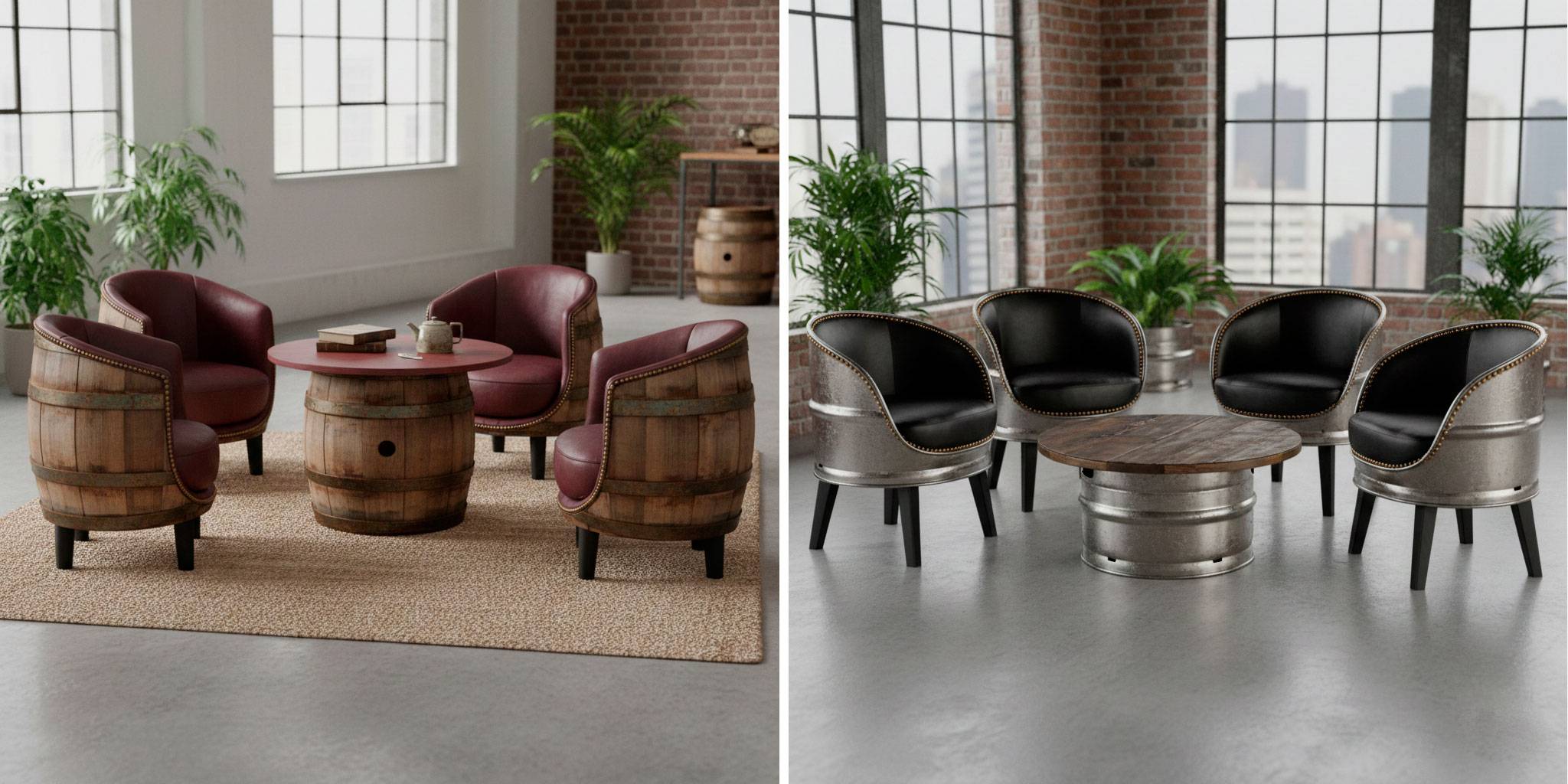 - Решение для опытных мастеров — кресла и столики из деревянных бочек. Идею можно реализовать и с металлическими кегами.