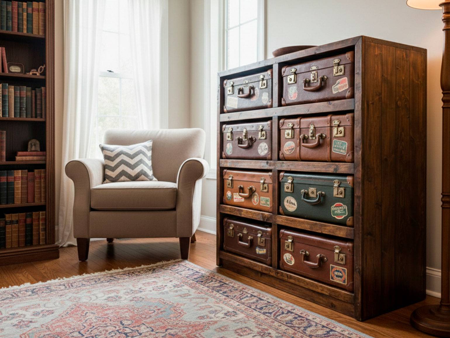- Комод с ящиками из старых чемоданов станет изюминкой гостиной или рабочего кабинета. Для такого формата подойдут винтажные изделия из кожи с деревянным каркасом. Корпус можно оставить от оригинального шкафа или стеллажа.