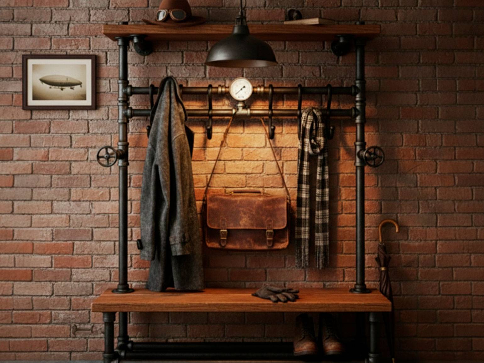 - Вешалка из водопроводных труб в стиле стимпанк отлично впишется в лофт-интерьер. Для декора можно приварить к ним вентили и манометры.