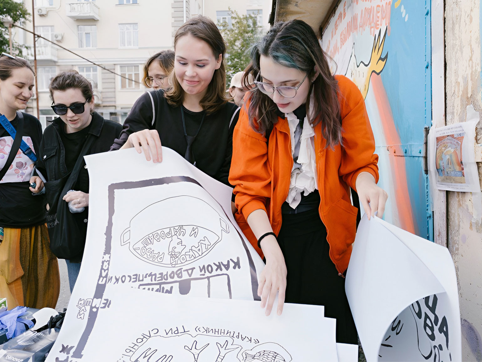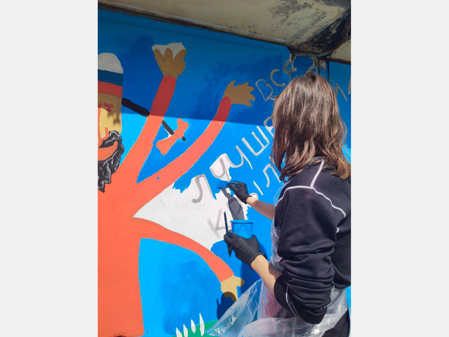 Екатерина разрисовывает стену гаража в рамках художественной акции в Екатеринбурге