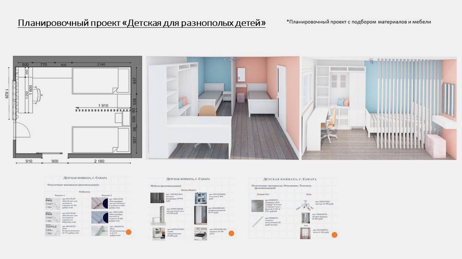 Я предложила зонирование с помощью цвета и реечных перегородок, выделила зоны для сна и учёбы и оставила место для хранения вещей. Клиентов такое решение устроило, сейчас проект находится на стадии реализации.