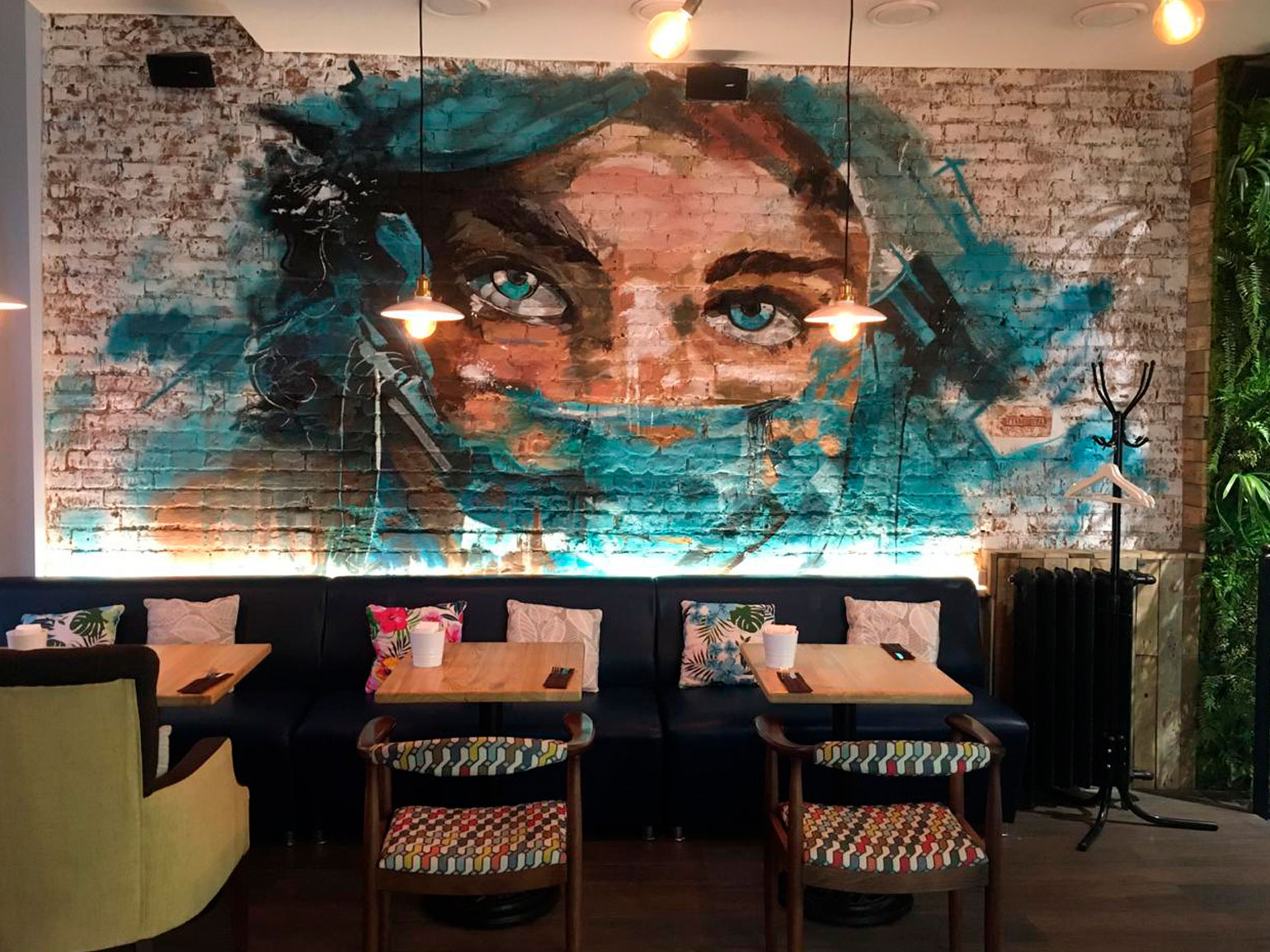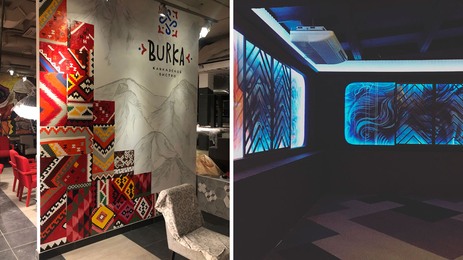 Например, в одном филиале Black Star Burger я расписывал стены под ковры, а ещё я оформлял пространство нескольких ресторанов Novikov Group и занимался воплощением дизайнов разных «Сыроварен» и уютного заведения «Хинкали-Эклеры» в Ростове-на-Дону.