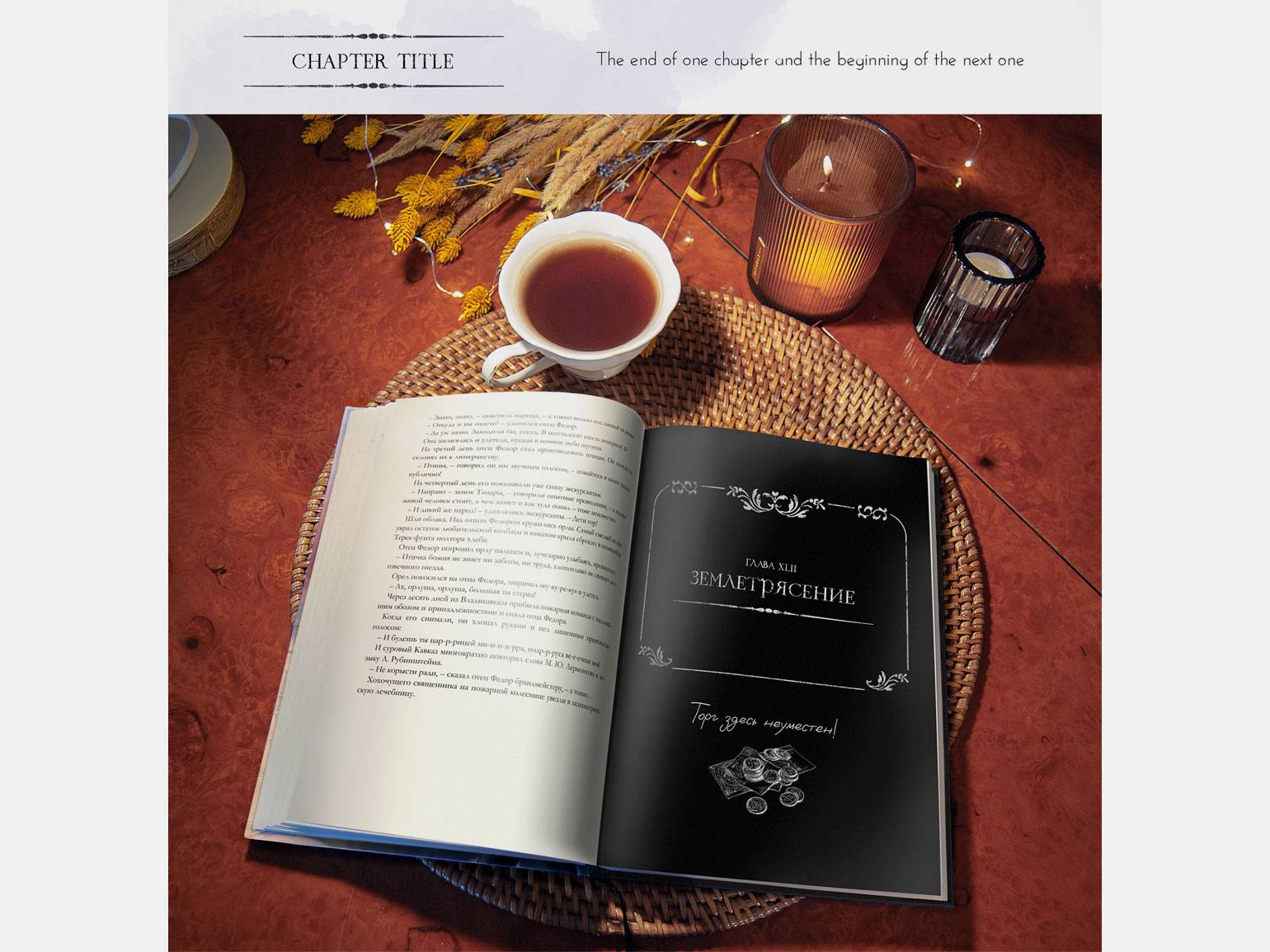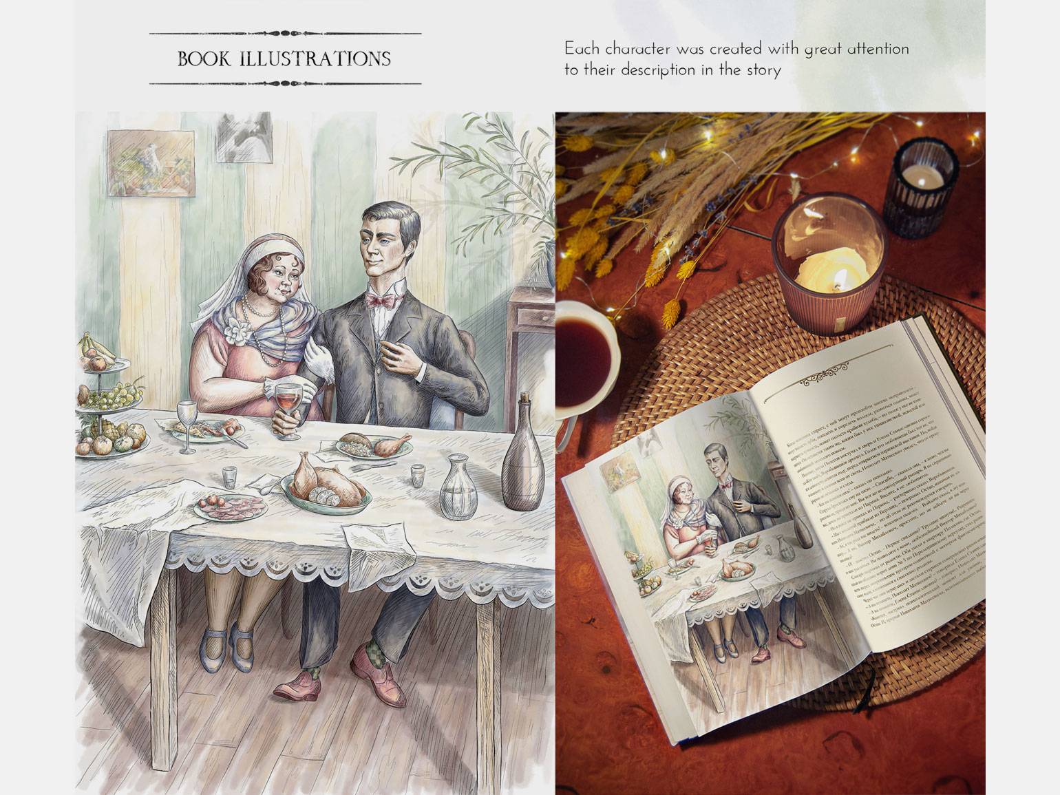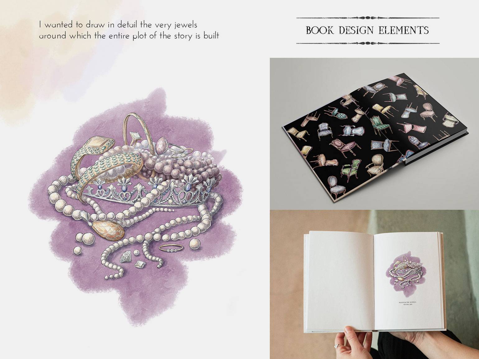 Я разработала целую концепцию, связанную с темой немого кино: нарисовала обложку, форзацы, несколько полосных и полуполосных иллюстраций, сделала вёрстку нескольких разворотов, сама всё сфотографировала для визуализации на макетах.