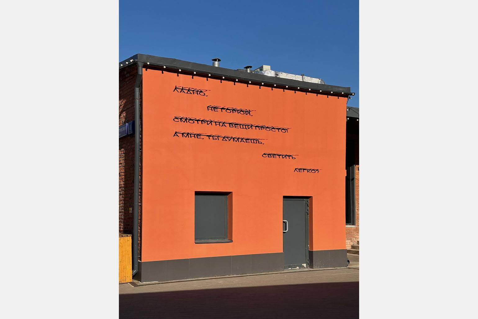На фасаде одного из строений — портрет Маяковского от легендарного португальца Vhils, «выбитый» отбойным молотком вместо кистей и баллончиков. А в 2025-м на одной из терракотовых стен пространства появилась цитата поэта, которую можно разглядеть только в солнечную погоду: железные конструкции оставляют тени из букв и яркий след в сердцах прохожих.