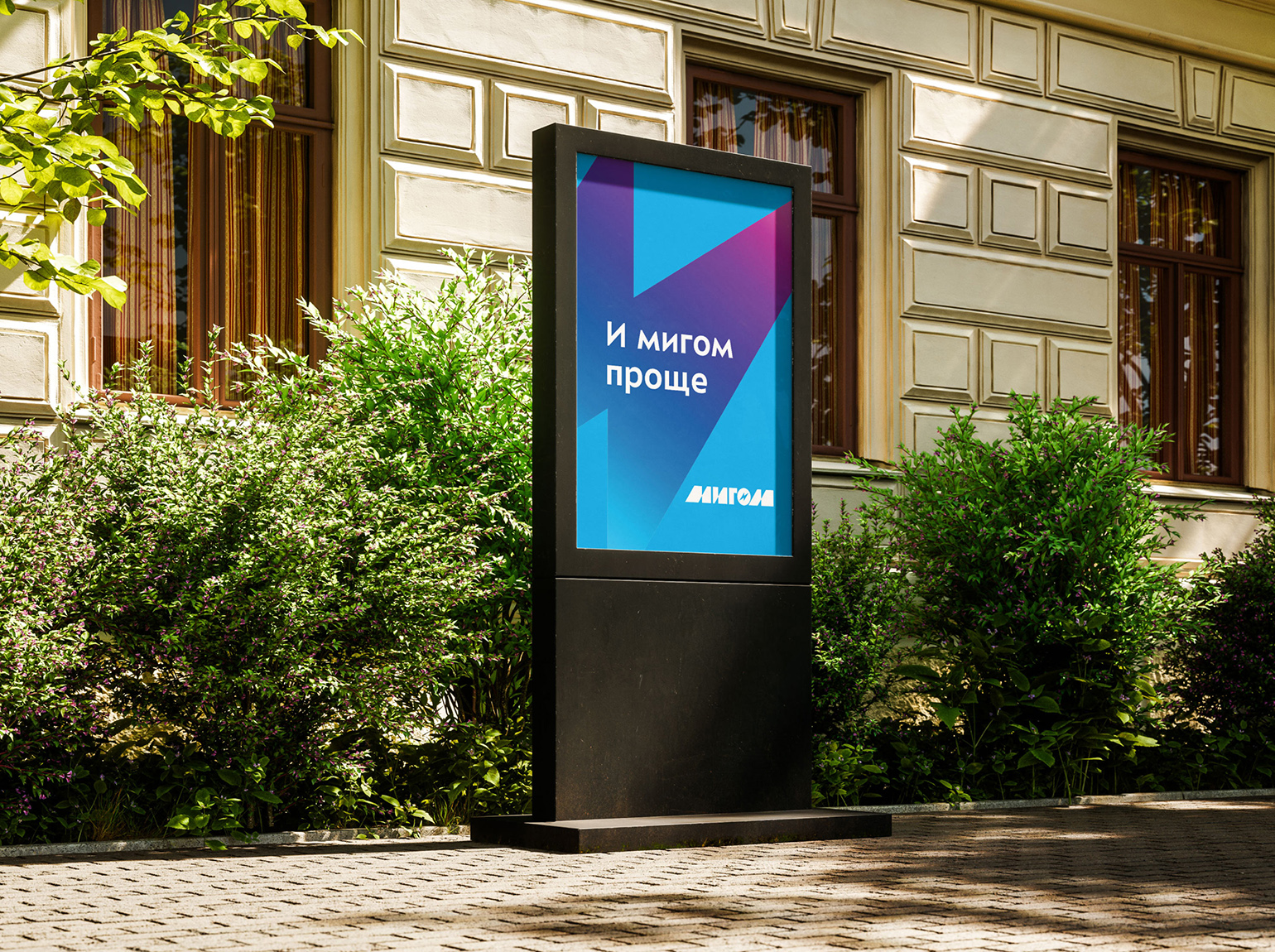 Название «Мигом» отражает цель платформы — сделать привычные процессы быстрее и проще. Логотип — строгая динамичная надпись. Внутри букв заложена метафора передачи данных — направленные друг к другу лучи. Молния указывает на скорость работы, а преломление лучей и градиент подчеркивают разнообразие сценариев использования.