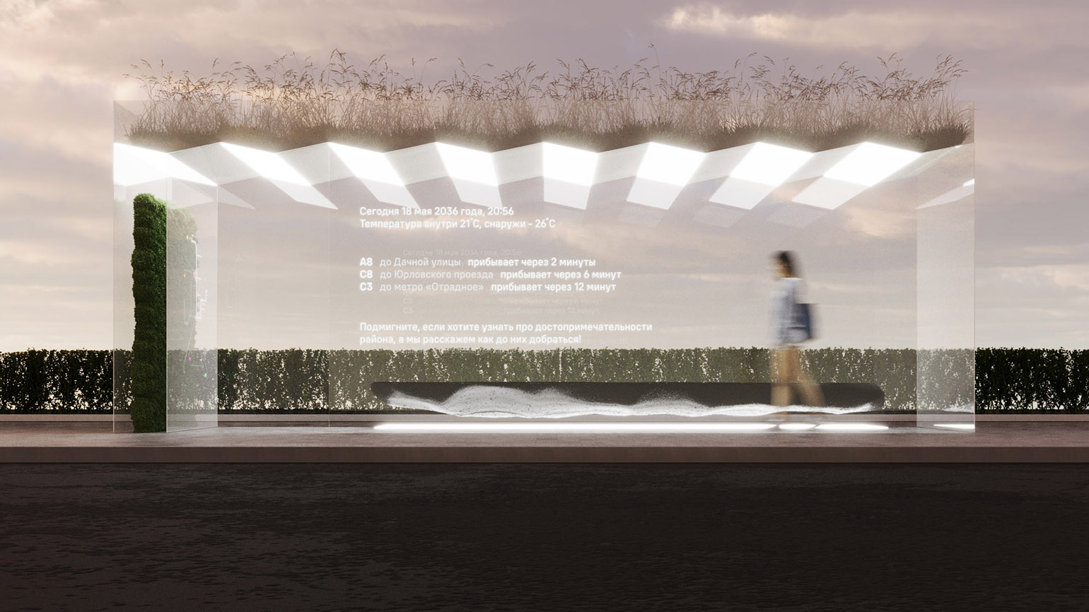 Фасад остановки выполнен в виде единой прозрачной интерактивной панели smart glass. В верхней левой части выводится ключевая информация: дата, погода и время прибытия транспорта. Нижний сегмент отведён под познавательный контент.