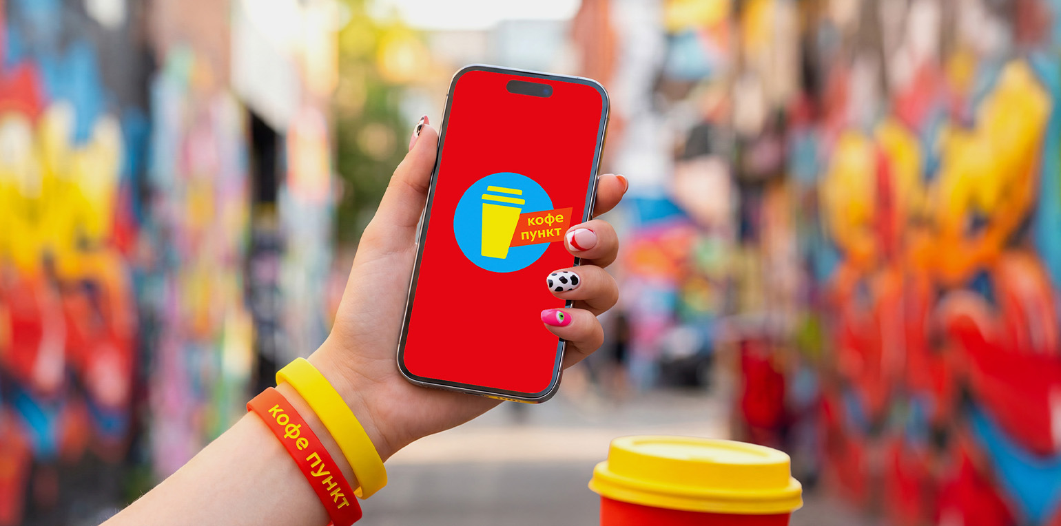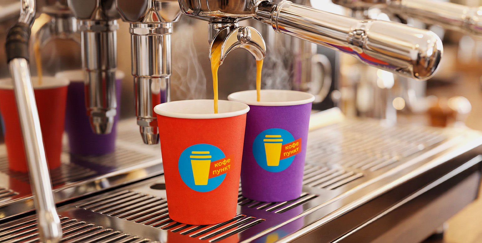 Логотип выполнен в виде синего круга с жёлтым стаканчиком внутри, справа надпись «Кофепункт» в две строчки жёлтыми буквами на красном фоне. Цвета, видимо, выбраны те, что уже ассоциируются с пунктами выдачи маркетплейсов Ozon и «Яндекс Маркет».