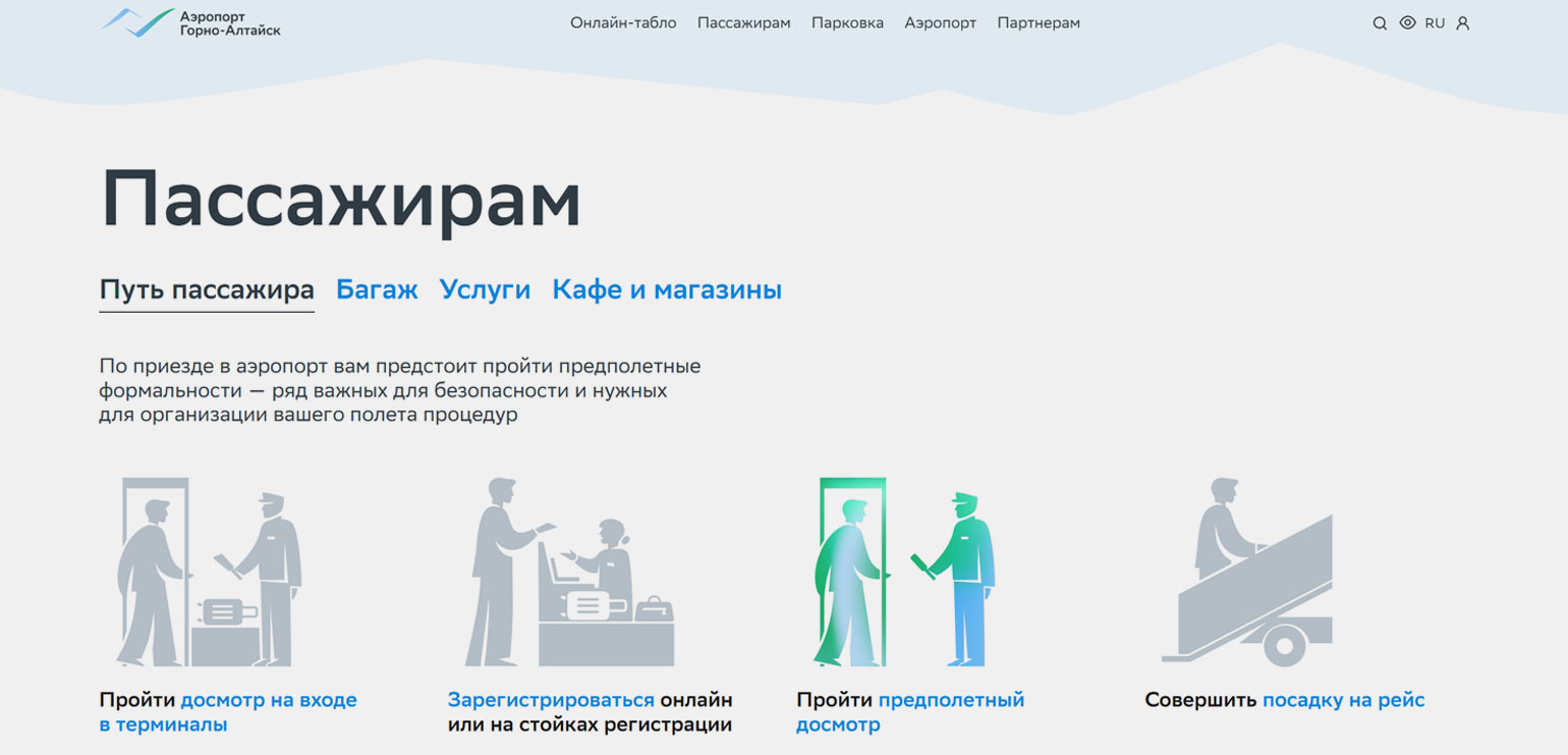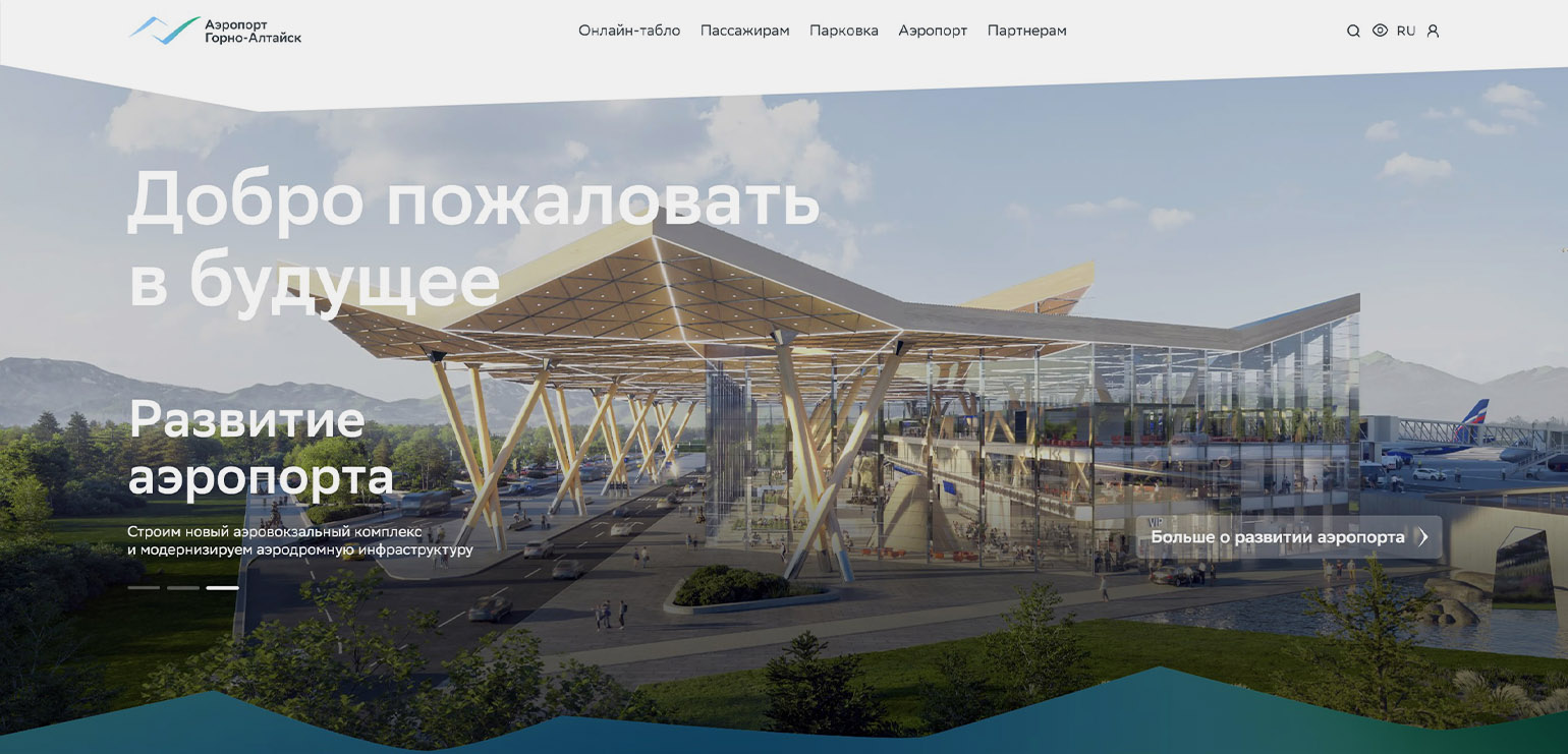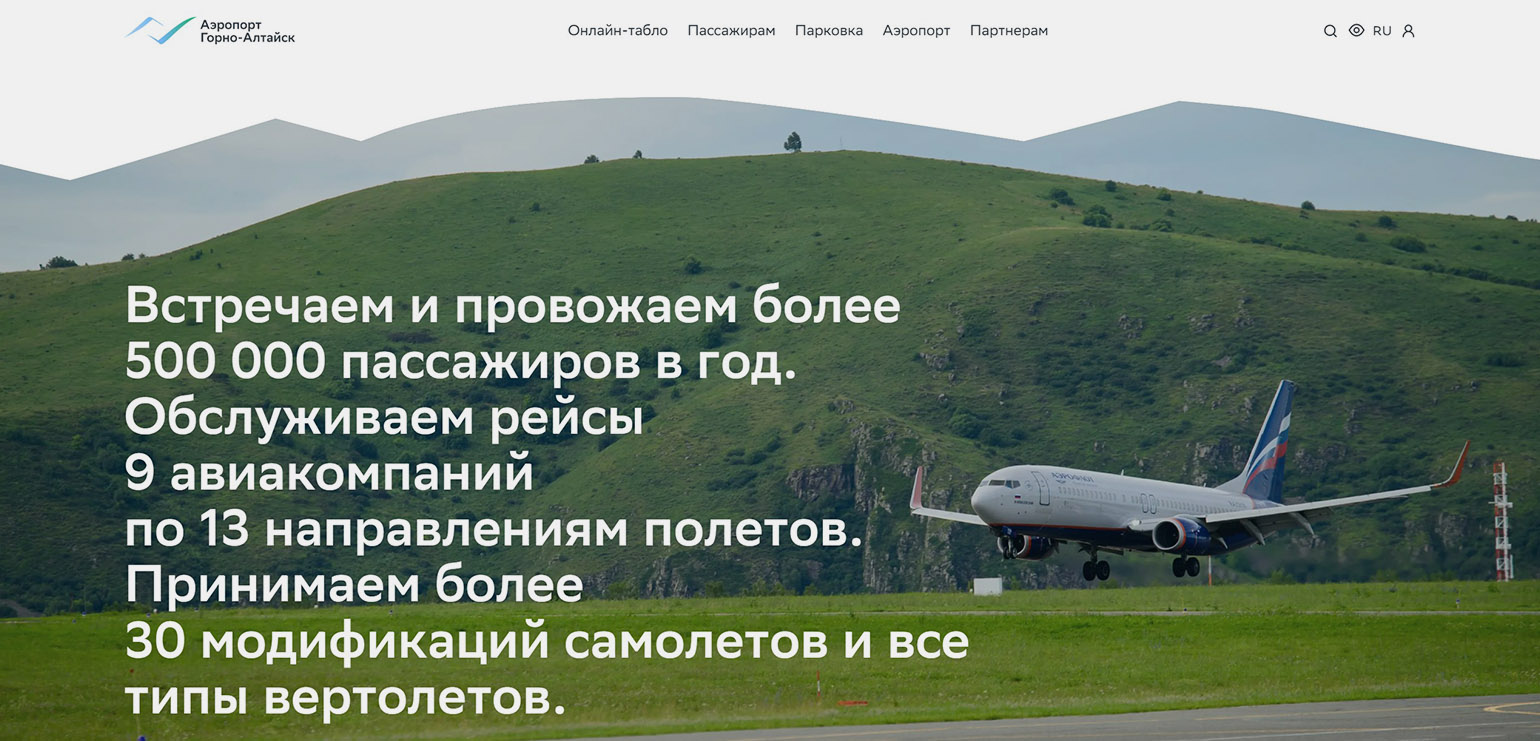 Особенность дизайна — эффект параллакса, который создаёт ощущение полёта и «воспроизводит воздушную перспективу горных пейзажей». Наиболее востребованная страница — онлайн-табло с рейсами, откуда можно переходить к другим разделам с важной информацией. Специальная графика и иллюстрации подробно рассказывают о работе аэропорта и его услугах для пассажиров.