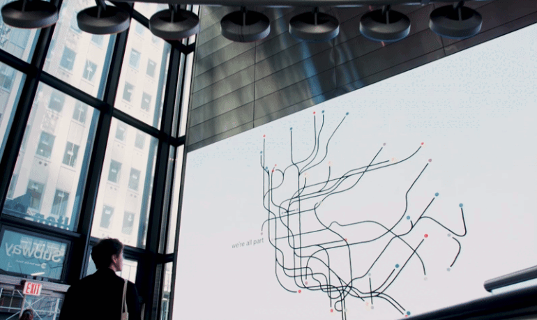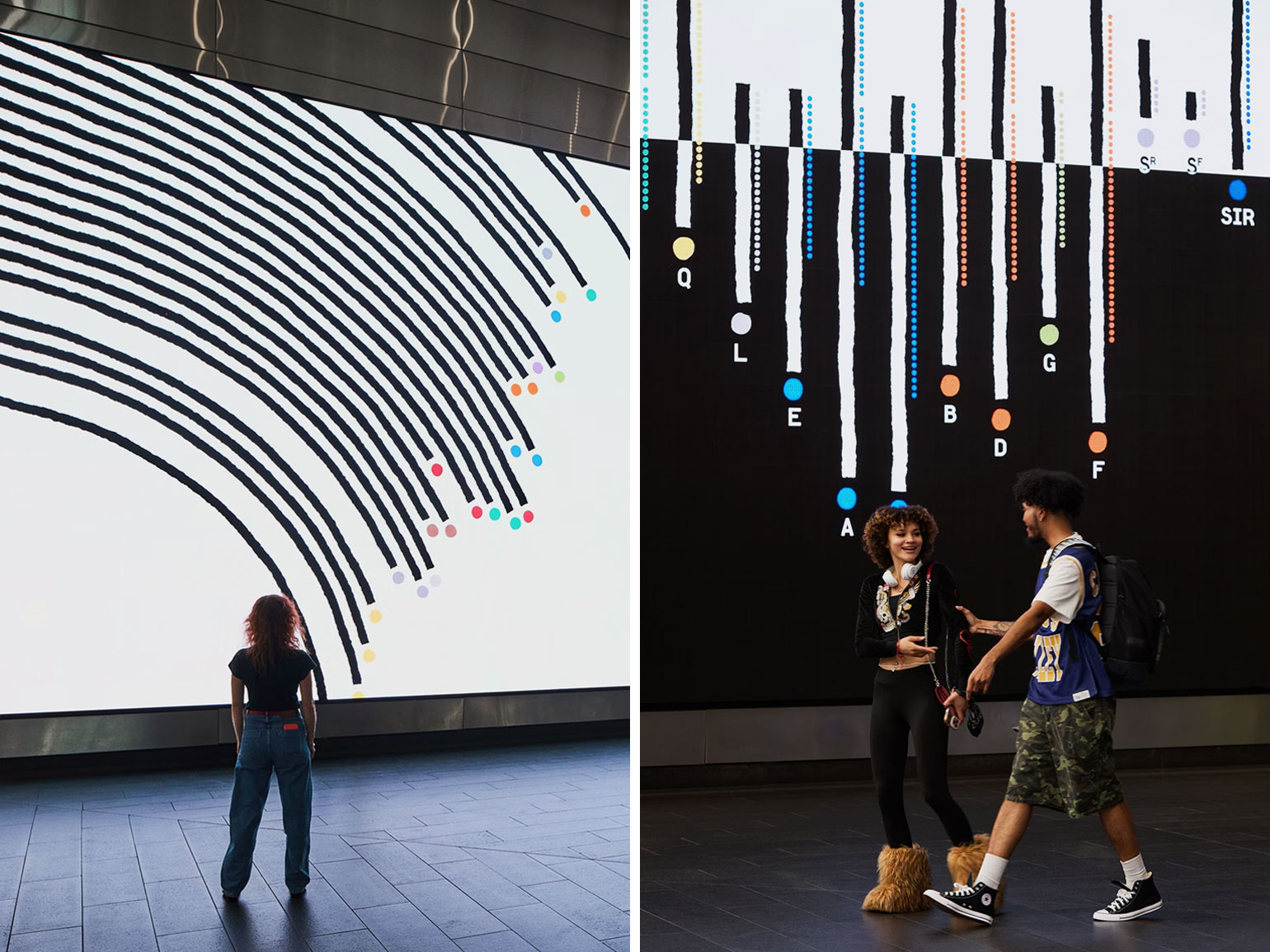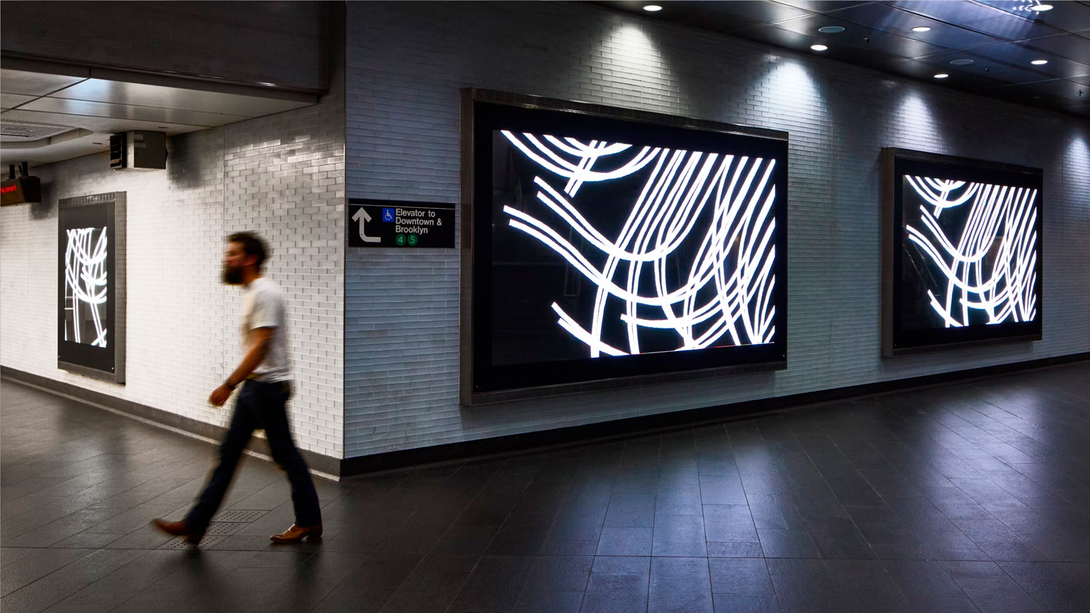 К 40-летию узла метро Fulton Center (Нью-Йорк) дизайнеры создали двухминутную дата-анимацию, синхронно идущую на 52 экранах в подземке (она повторяется в начале каждого часа). Это пример того, как айдентика и визуализация данных выходят за пределы «носителей» и становятся частью городской ткани.