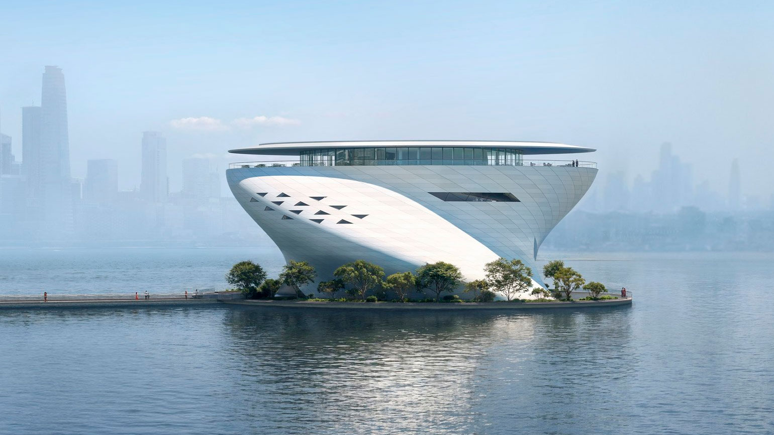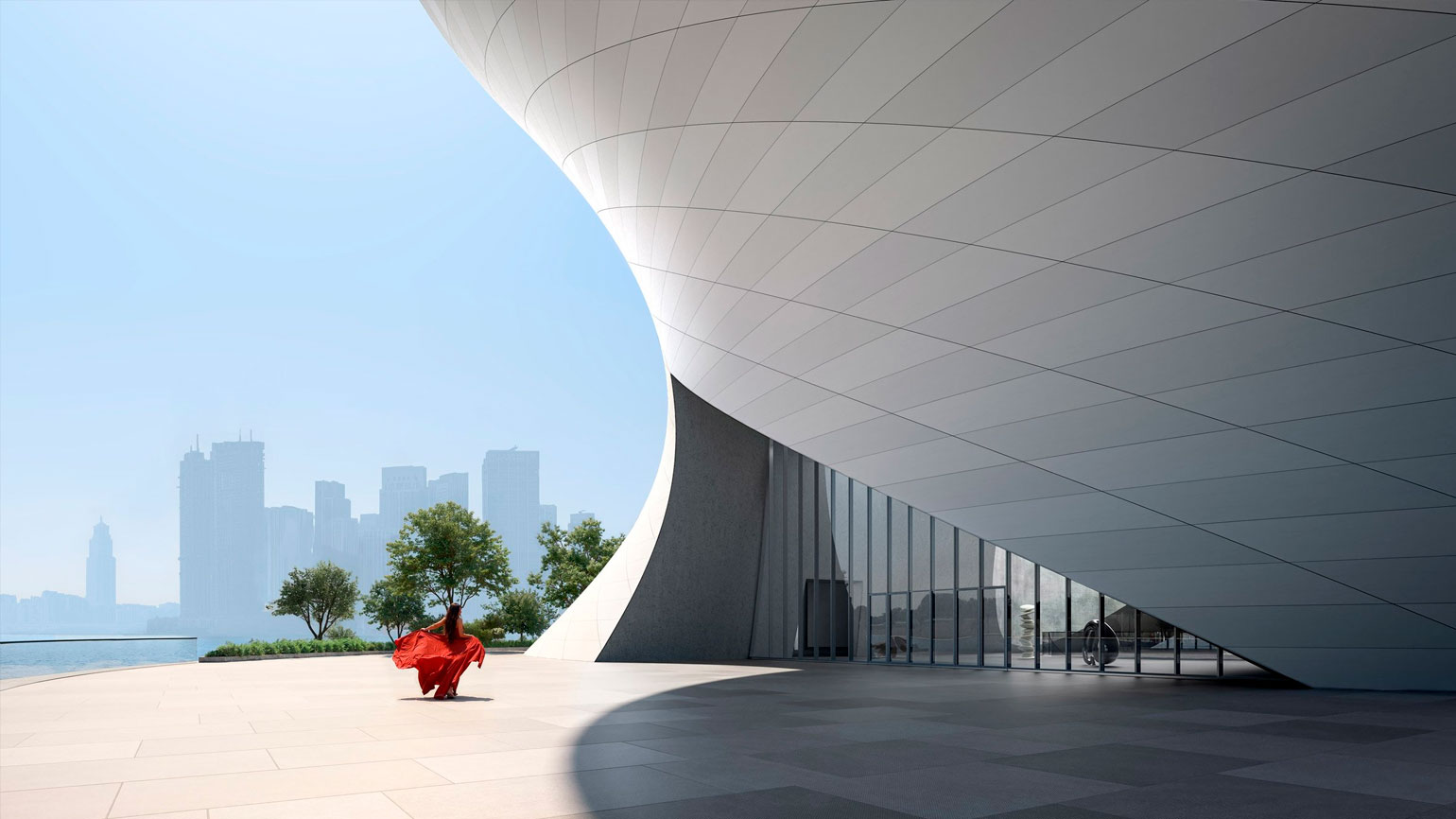 На представленных рендерах музей изображён с изогнутыми белыми стенами и прорезанными треугольными проёмами, сужающимися вверх. К закату поверхность музея отражает меняющиеся оттенки неба, одновременно смягчая острые углы и придавая сооружению более округлый, атмосферный вид.