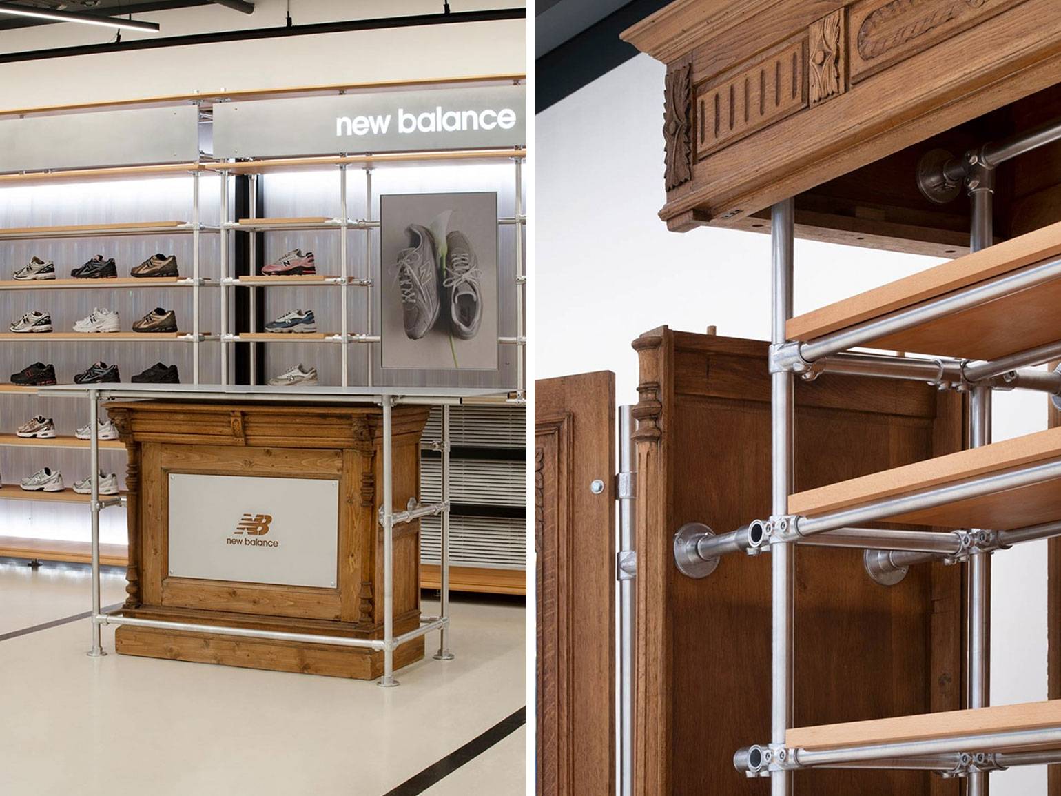 Пример — Atelier Craft x New Balance. К 120-летию New Balance французская студия Atelier Craft «приспособила» антикварную мебель под кроссовки. Старинный шкаф для белья стал витриной, прилавок превратили в кассу, ящики — в полки для аксессуаров (мебель можно вернуть к прежнему виду).