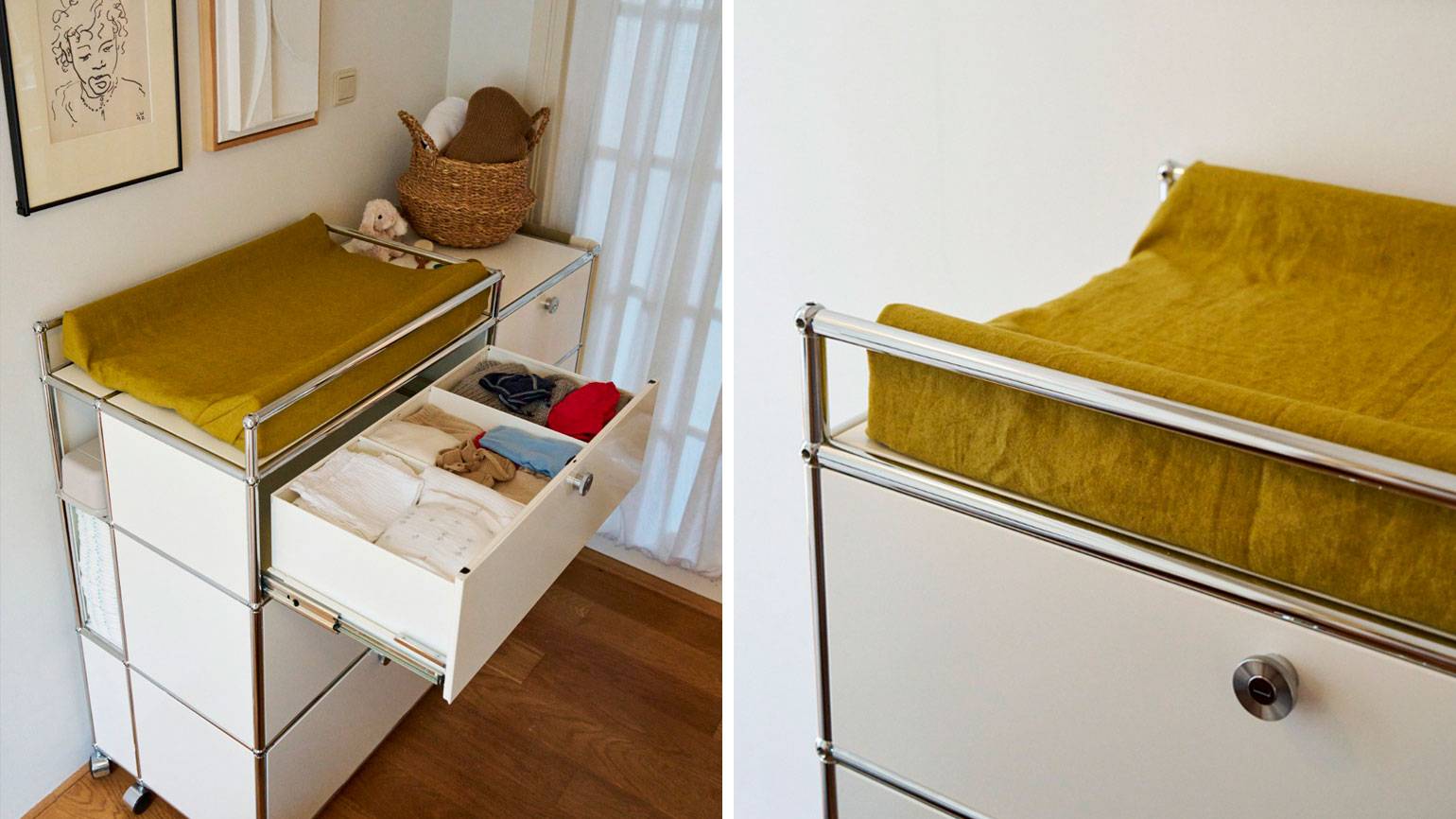 Пример — USM Haller. Компания выпустила стеллаж USM Haller E с беспроводной зарядкой и светом прямо в конструкции, а также модуль с пеленальным столиком.