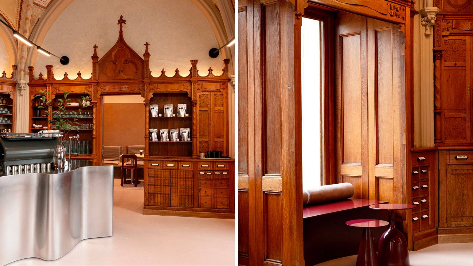 Пример — Laboratorium от студии EktraArhitectura. Новая кофейня в здании Széki Palace, где с 1893 года располагалась аптека. Дизайнеры сохранили резную дубовую мебель от B. Bak Lajos, сводчатые потолки, латинские надписи Officium, Receptura, Laboratorium. Аптечные шкафы теперь для кофе, а не лекарств.