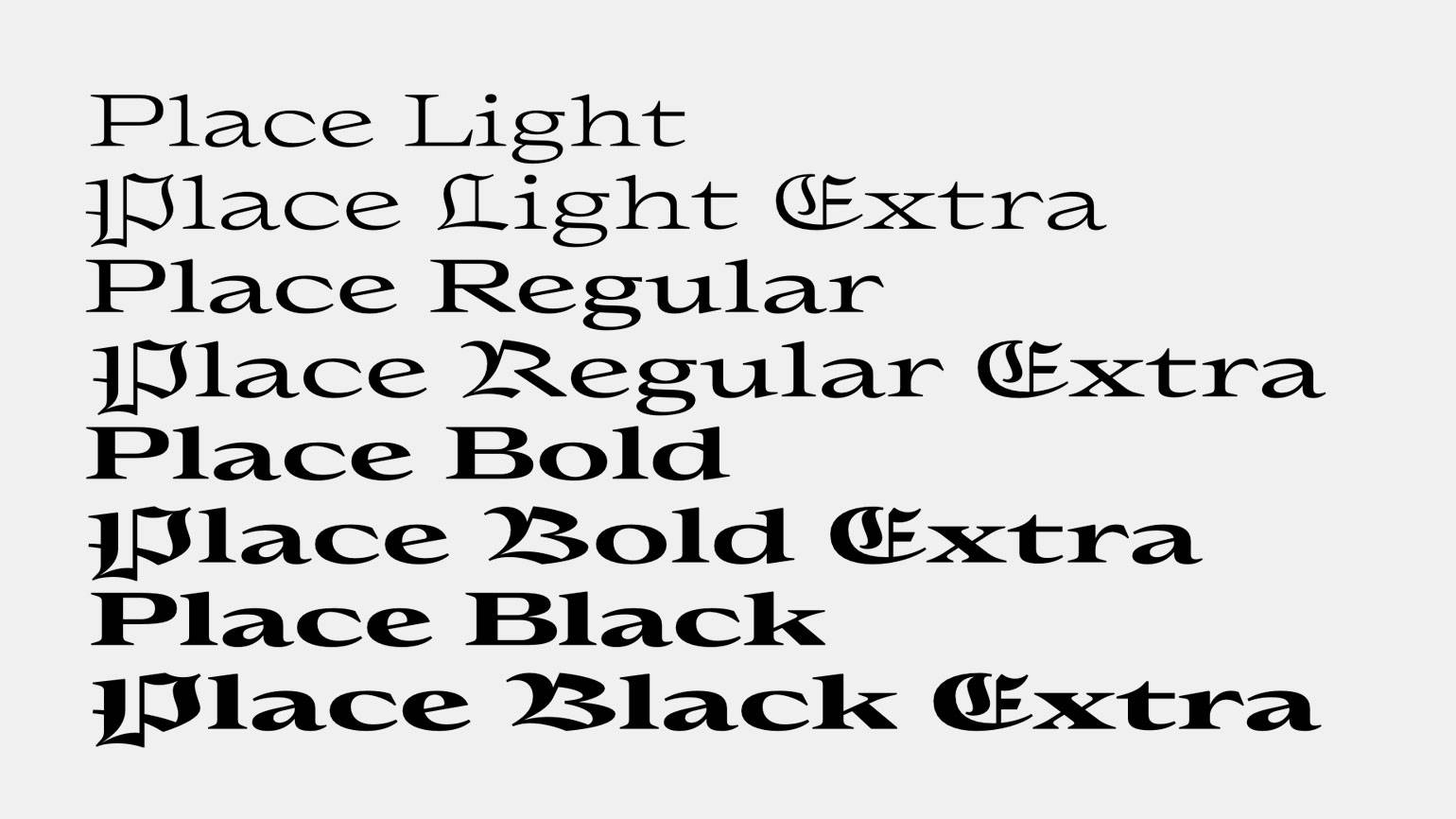 Ещё один важный релиз Commercial Type — шрифт французского дизайнера и каллиграфа Жюльена Прие — Place. Эта широкая элегантная антиква с высоким контрастом и готическими прописными выделяется своими пропорциями. Она стала первым шрифтом этого направления в дизайне.