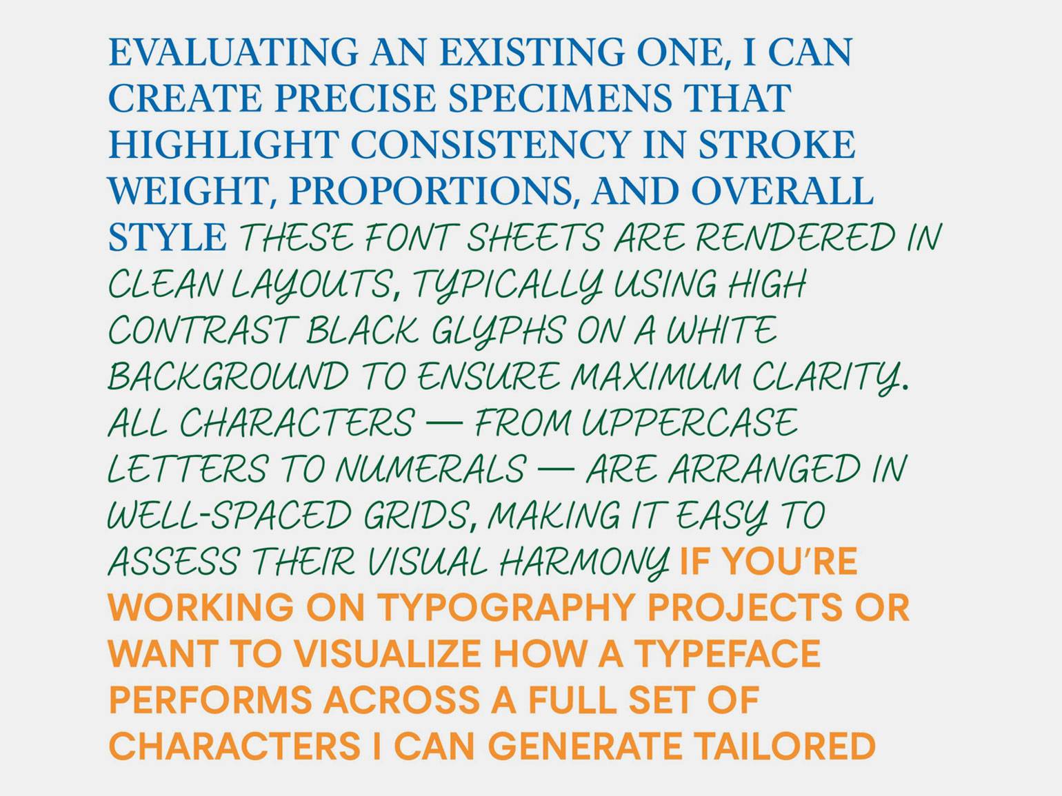 Кай Бернау, Уэйн Дэли, Рафаела Хефлигер и Алис Савуа в рамках ресёрч-программы ECAL исследовали, как шрифтовые дизайнеры и инженеры пользуются в работе нейросетями и технологиями машинного обучения. Проект I Love Typography организовал онлайн-конференцию, посвящённую искусственному интеллекту и шрифтам. А многие другие дизайнеры увлечённо обсуждали в соцсетях шрифты, которые создатель FontLab Юрий Ярмола нарисовал с помощью ChatGPT.