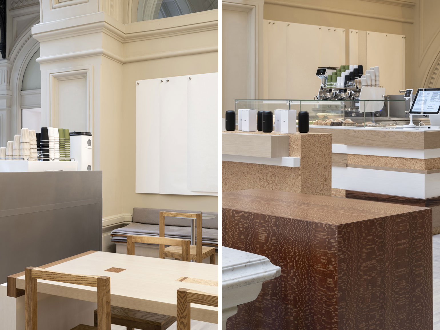 Витрина с десертами и стол для мерча выполнены из нескольких пород шпона со срезами, а строгая геометрия мебели — преимущественно прямоугольной — вписана в пространство с арками. Отдельное внимание уделили фактуре и деталям: металлические элементы, например, подставки для приборов вписаны в интерьер, а не спрятаны.