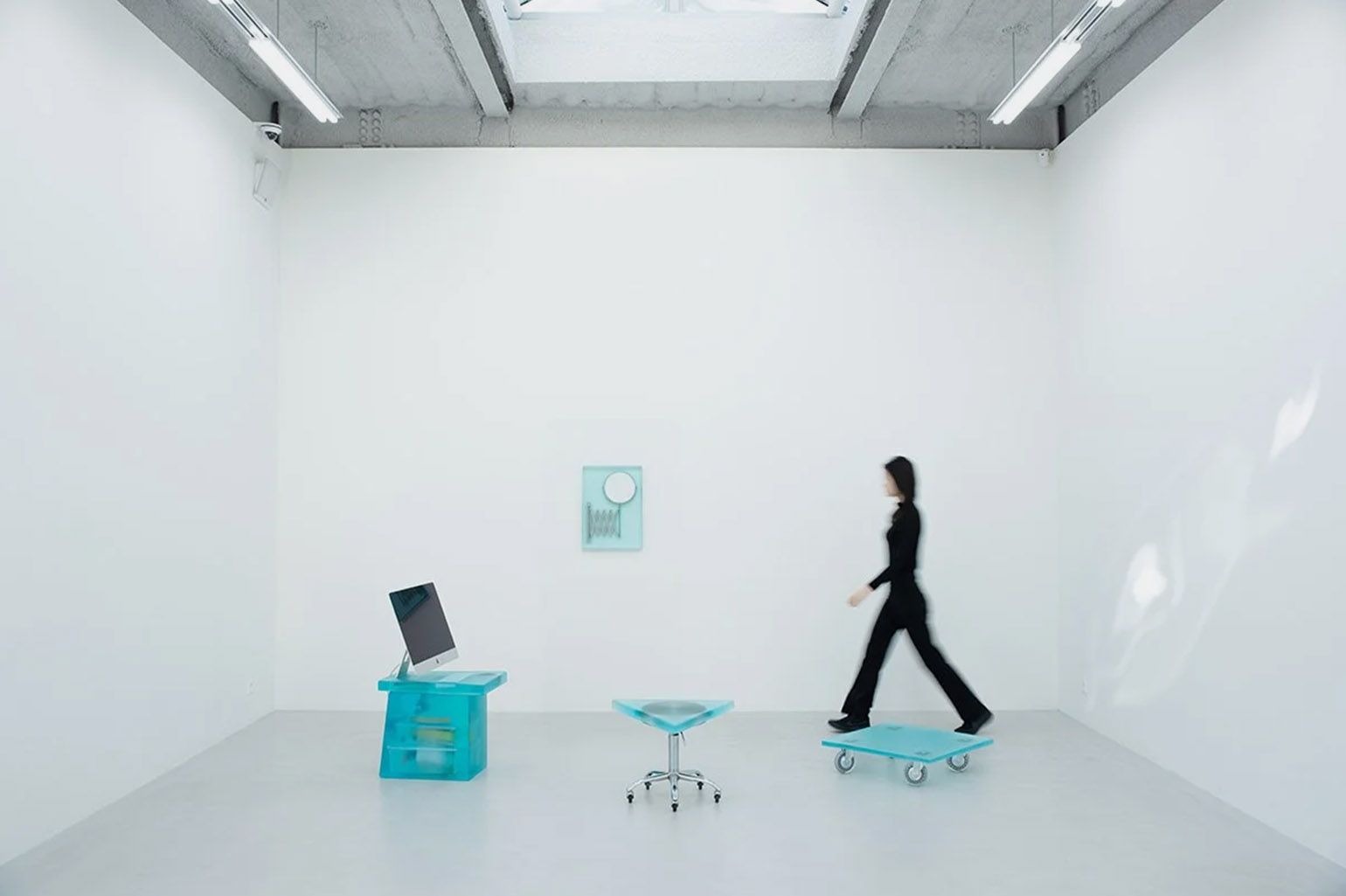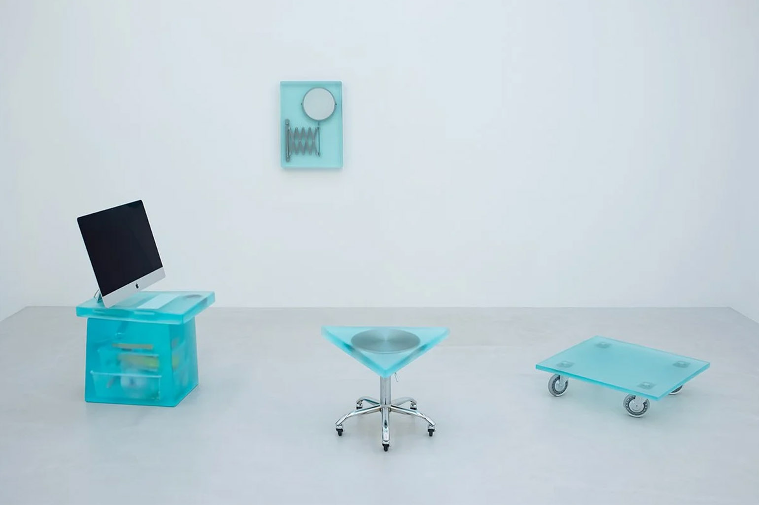 В Dip2 студийный табурет трансформируется в аморфную треугольную форму: исходное сиденье угадывается внутри объёма, но теряет прежнюю читаемость. Dip3 лишает регулируемое зеркало его основной функции — отражения: после заливки смолой оно становится полупрозрачной скульптурой. В Dip4 сломанная тележка получает новую столешницу из смолы и превращается в низкий стол — колёса остаются, но уже не работают.