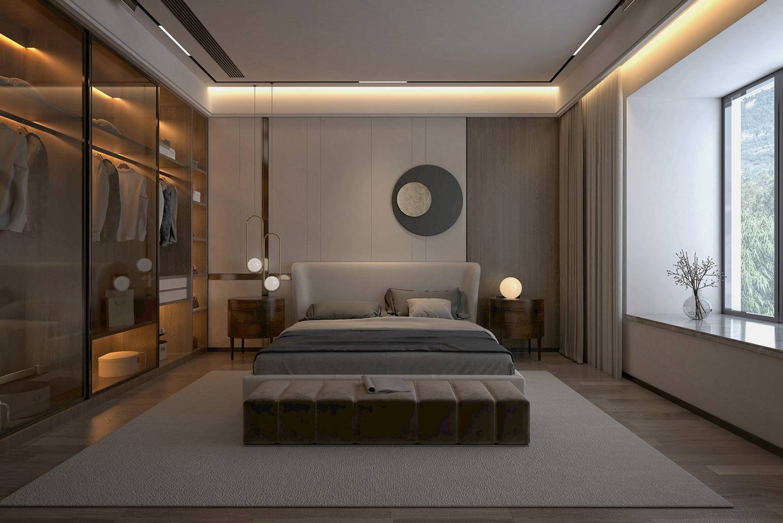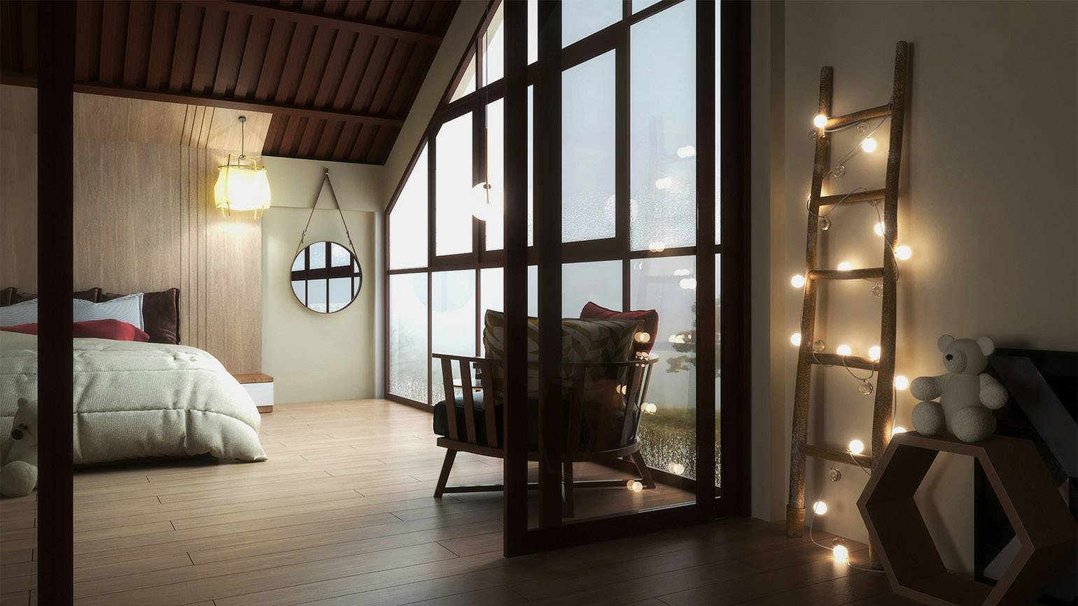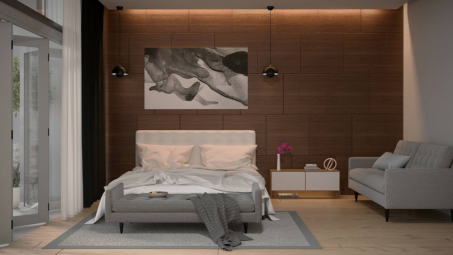 Свет попадает в помещение через окна, панорамные проёмы и световые люки. Он создаёт тени, подчёркивает объём и влияет на восприятие цвета.