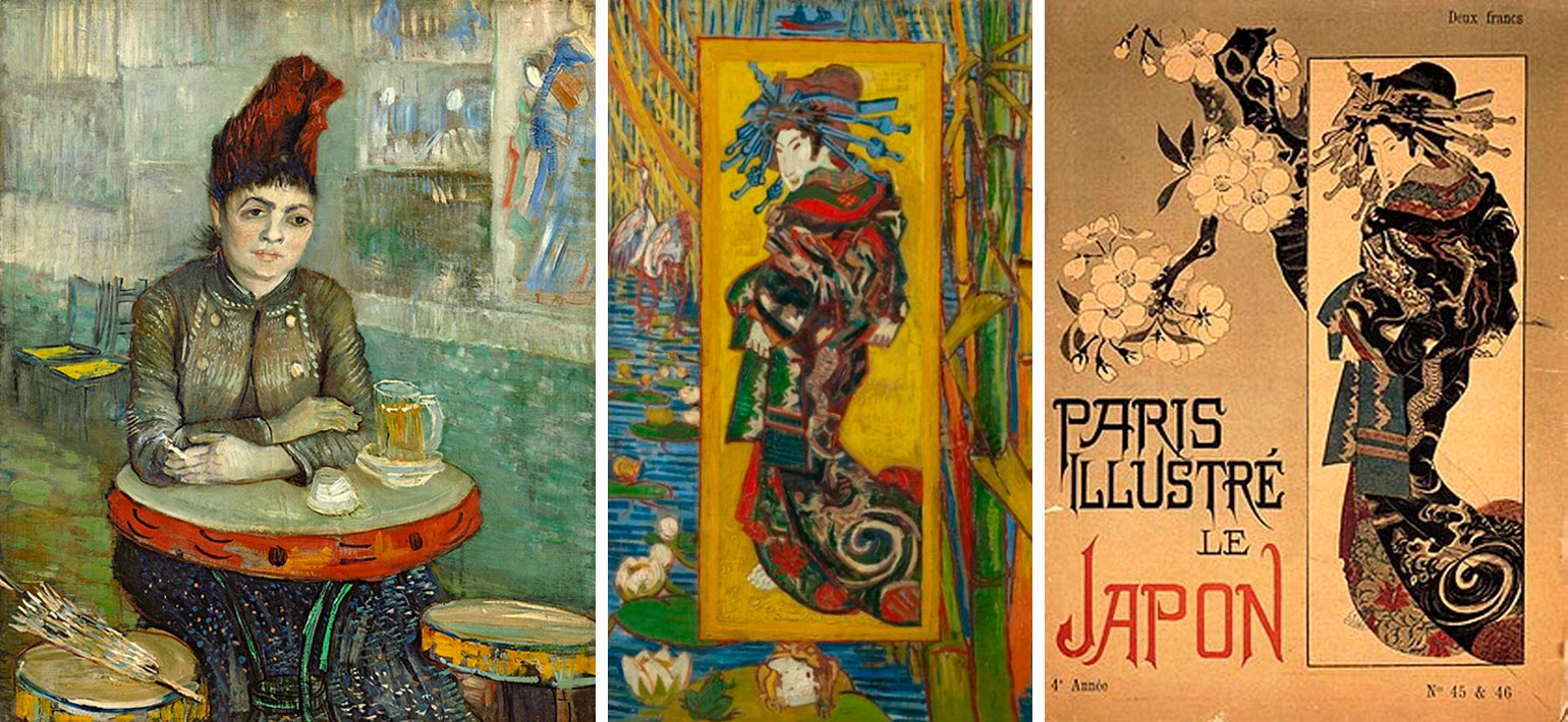 В кафе «Тамбурин», владелицей которого была Агостина Сегатори, в 1887 году Ван Гог сделал выставку своей коллекции японских гравюр. У правого края её портрета, который он написал, видно изображение куртизанки: художник, используя метод сетки, скопировал и увеличил на отдельный холст. Эта гравюра Кесаи Эйзена была на обложке журнала Paris Illustré в 1886 году.