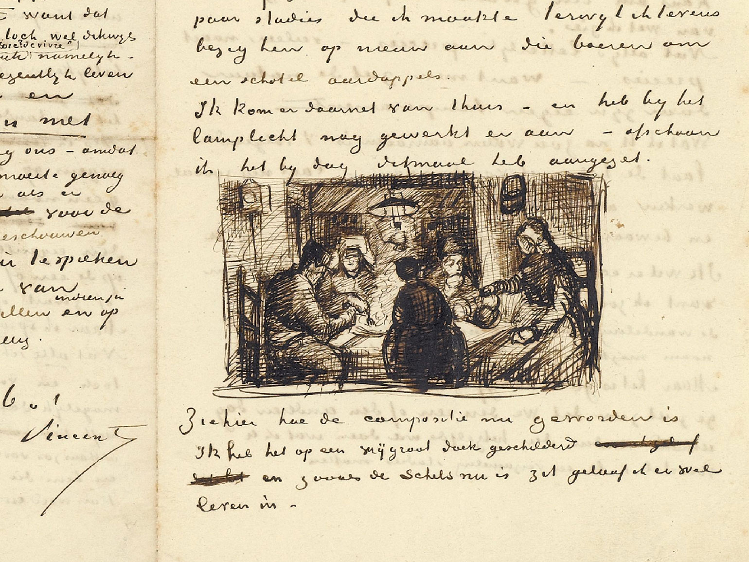 Символическим итогом раннего периода творчества в Нидерландах стало полотно «Едоки картофеля», написанное Ван Гогом в его родной провинции Брабант. Предварительно он сделал немало портретов в поисках типажей. Тёмные, мятые лица крестьянской семьи в тусклом свете лампы сами как картофелины, возделанные этими натруженными руками. Рембрандтовские резкие тени на лицах, контровой свет фигуры на первом плане.