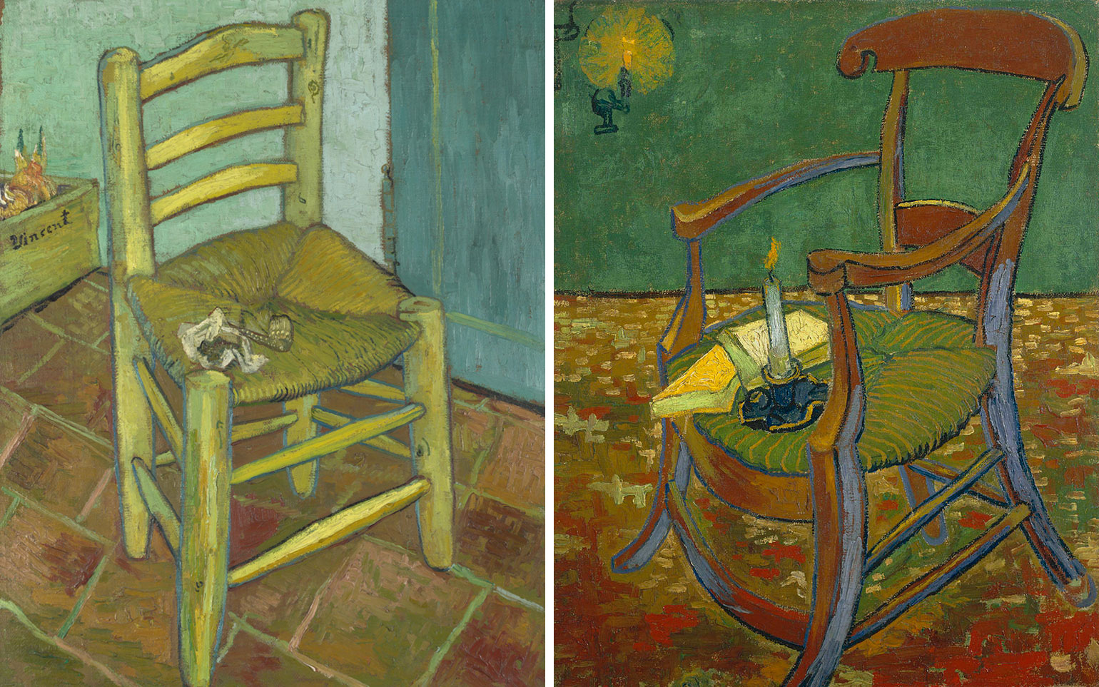 Неординарную пару портретов пишет Ван Гог, живя с Гогеном под одной крышей: их мебель. Менее удобный, стоящий на кафеле стул без подлокотников словно немного шатается, символизируя неуверенность и постоянное творческое волнение. Кресло же раскидало свои ножки по ковру, чтобы прочно стоять, а сидящий мог удобно в нём развалиться.