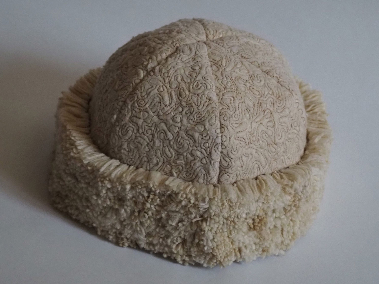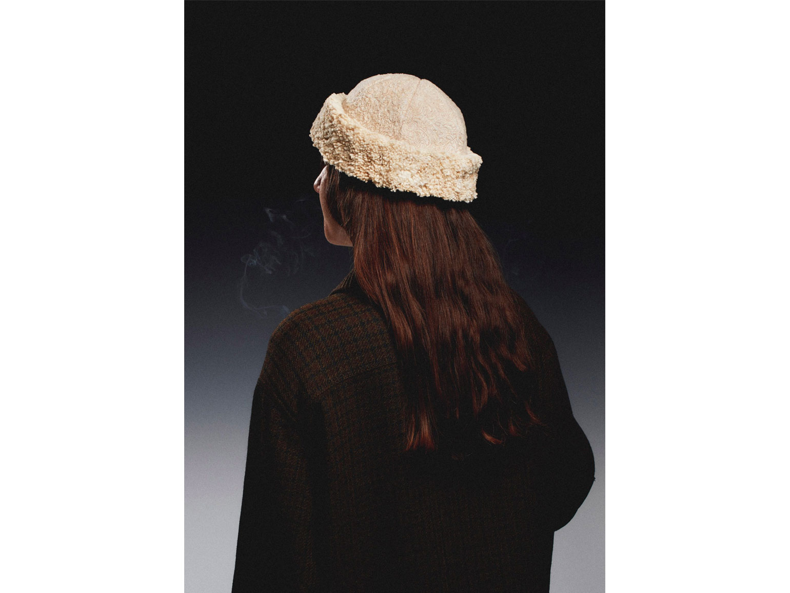 У шапки также есть полоса, напоминающая овчину, вокруг основания. Дизайнер создала её, поместив ряды коротких волокон в прямоугольную форму, на дне которой был слой расплавленного ацетата целлюлозы. После затвердевания всё это спрессовали в полосу.