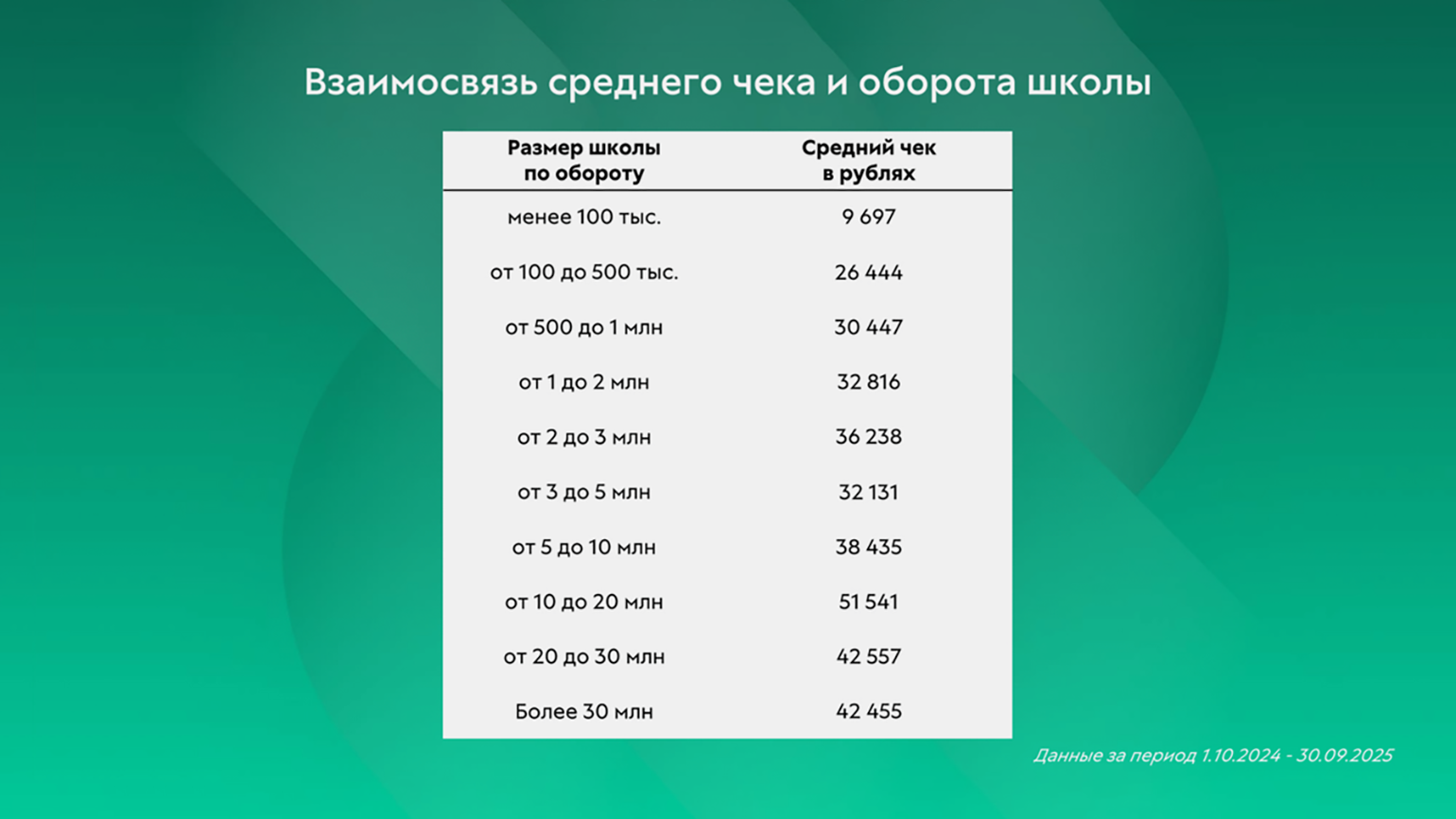 Многие онлайн-школы, стремясь масштабировать бизнес, включают дорогие программы в свою линейку, так как высокий средний чек напрямую связан с большими оборотами. Данные ниже хорошо иллюстрируют эту закономерность: крупные образовательные проекты обладают более высоким средним чеком по отношению к общему обороту.