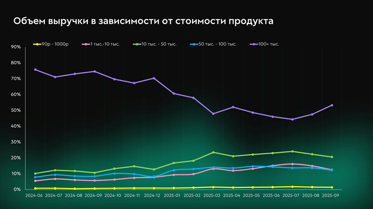Однако в 2025 году, по сравнению с 2024-м, доля дорогих курсов в общей выручке онлайн-школ снизилась от максимальных 75% в июне 2024-го до минимальных 50% в марте 2025-го. Продукты со средним чеком более 100 тысяч рублей по-прежнему доминируют, но сейчас рынок достиг более сбалансированного соотношения, при котором премиальный сегмент уже не демонстрирует столь значительный отрыв.
