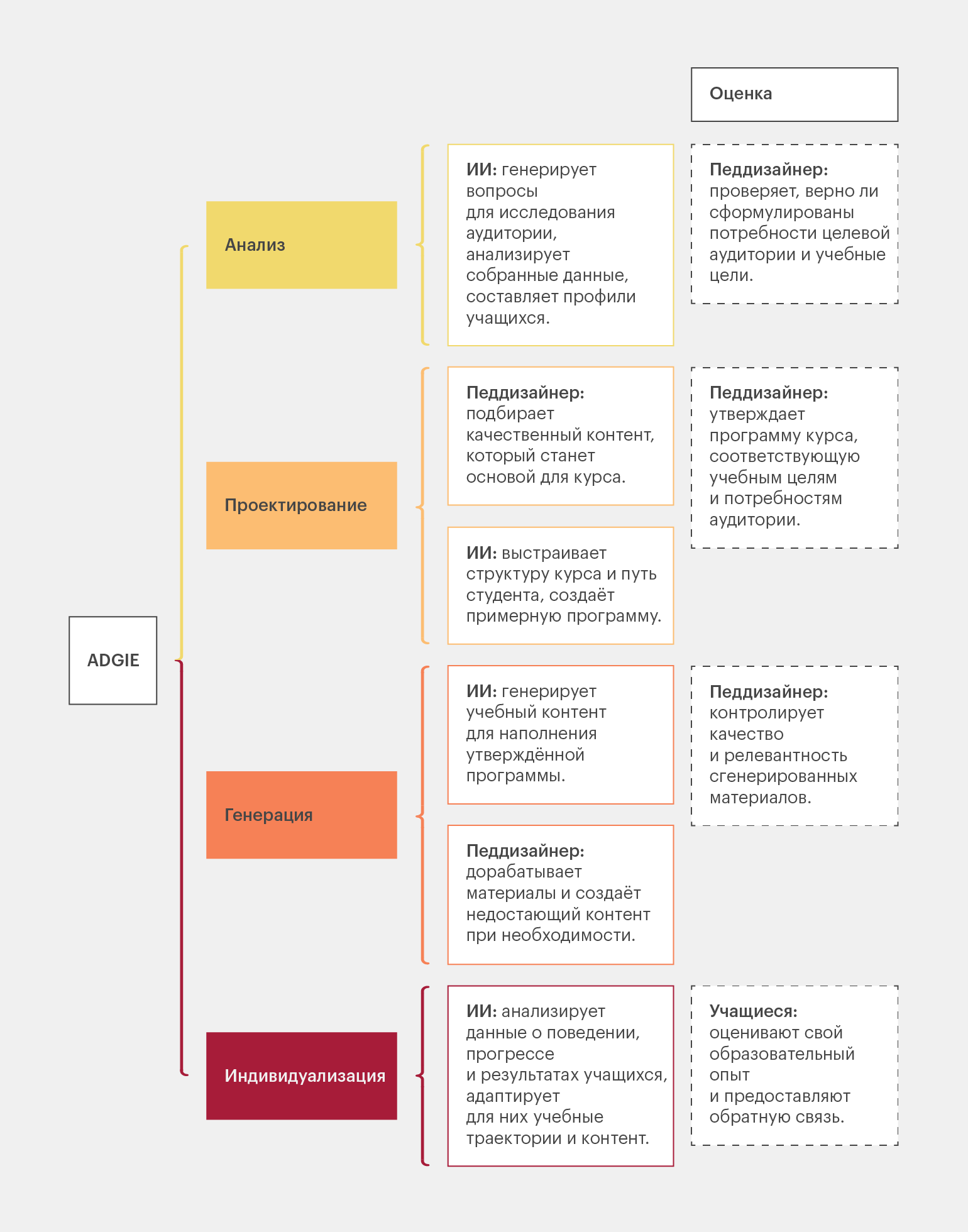 ADDIE в классическом виде не предусматривает коллаборации человека с ИИ и широких возможностей персонализации обучения, которые предлагают нейросети. Проведя опрос среди профессионалов в сфере образования, исследовательницы предложили свой способ адаптировать ADDIE к использованию ИИ-инструментов — и назвали эту модель ADGIE.