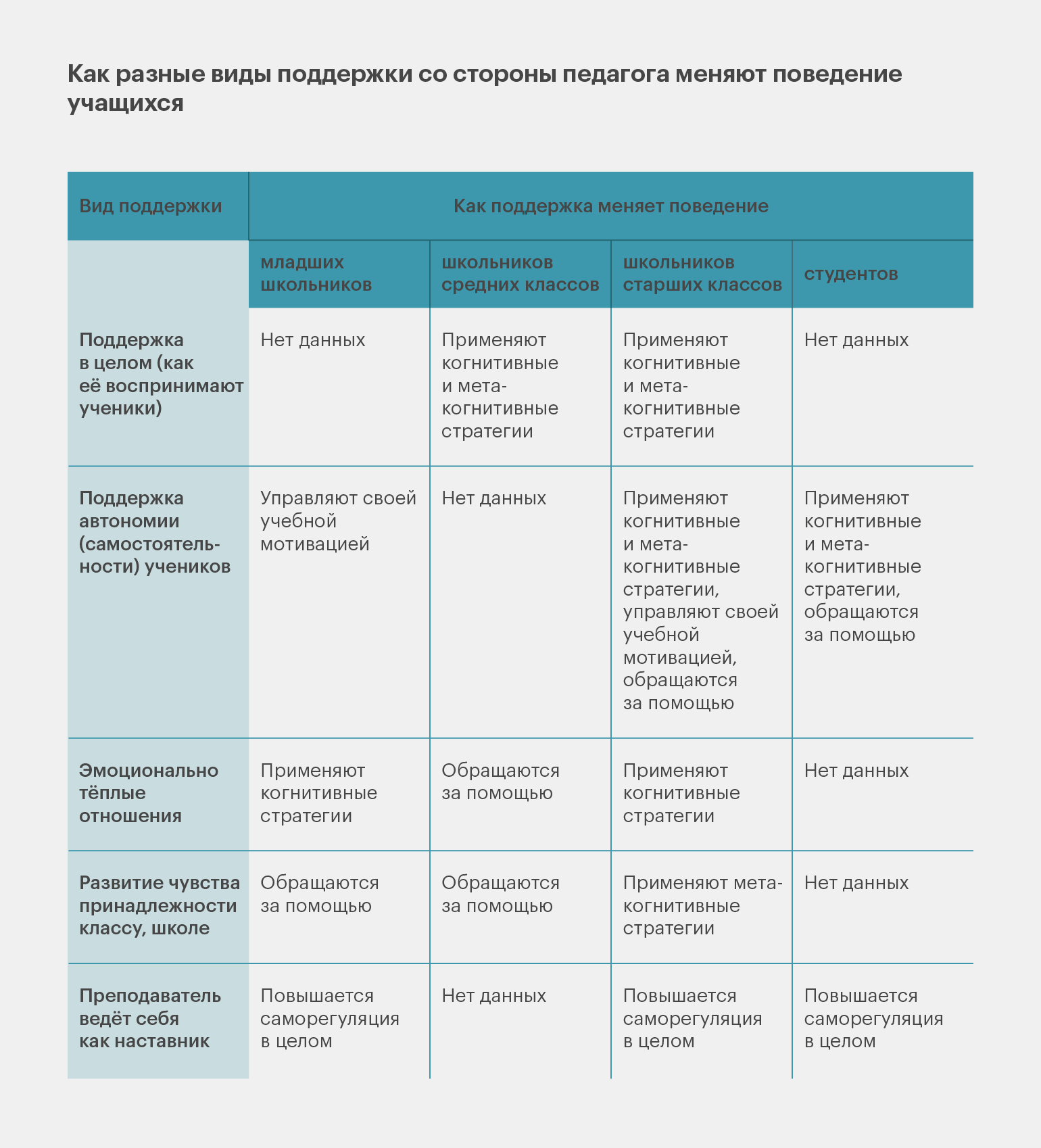 Вообще, наука неоднократно подтверждала, что поддержка педагогов помогает развивать у учащихся саморегуляцию. Например, исследование 2014 года, в котором приняли участие более 5000 старшеклассников из Австралии, показало: чем больше поддержки от учителя чувствуют школьники, тем регулярнее они применяют когнитивные и метакогнитивные стратегии в обучении. Проще говоря, благодаря поддержке педагогов дети учатся более вдумчиво, более осознанно и организованно.