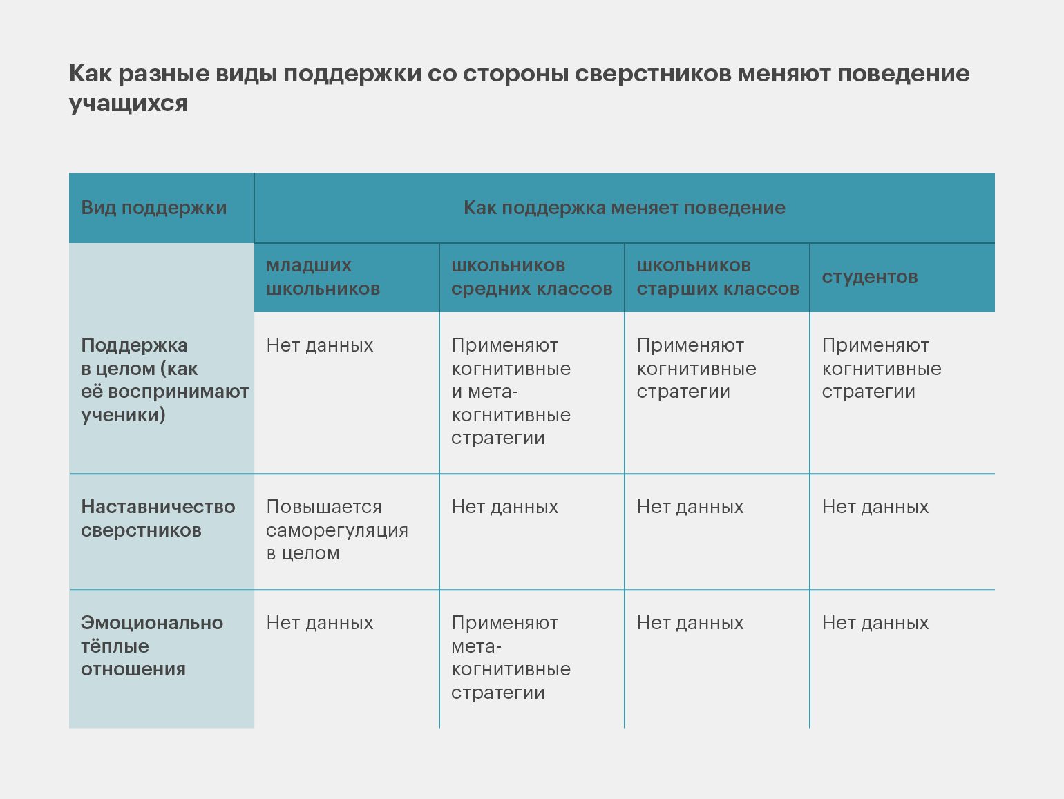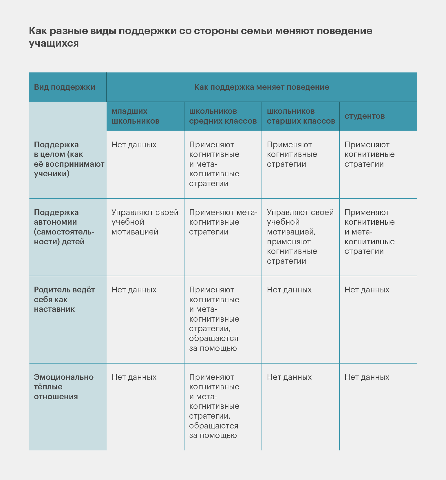Другие виды поддержки исследованы гораздо меньше. Но есть данные о том, что наставничество (как помощь в достижении учебных целей) со стороны родителей и эмоциональная близость в семье способствуют когнитивной и метакогнитивной саморегуляции подростков, а также эффективному использованию ресурсов.