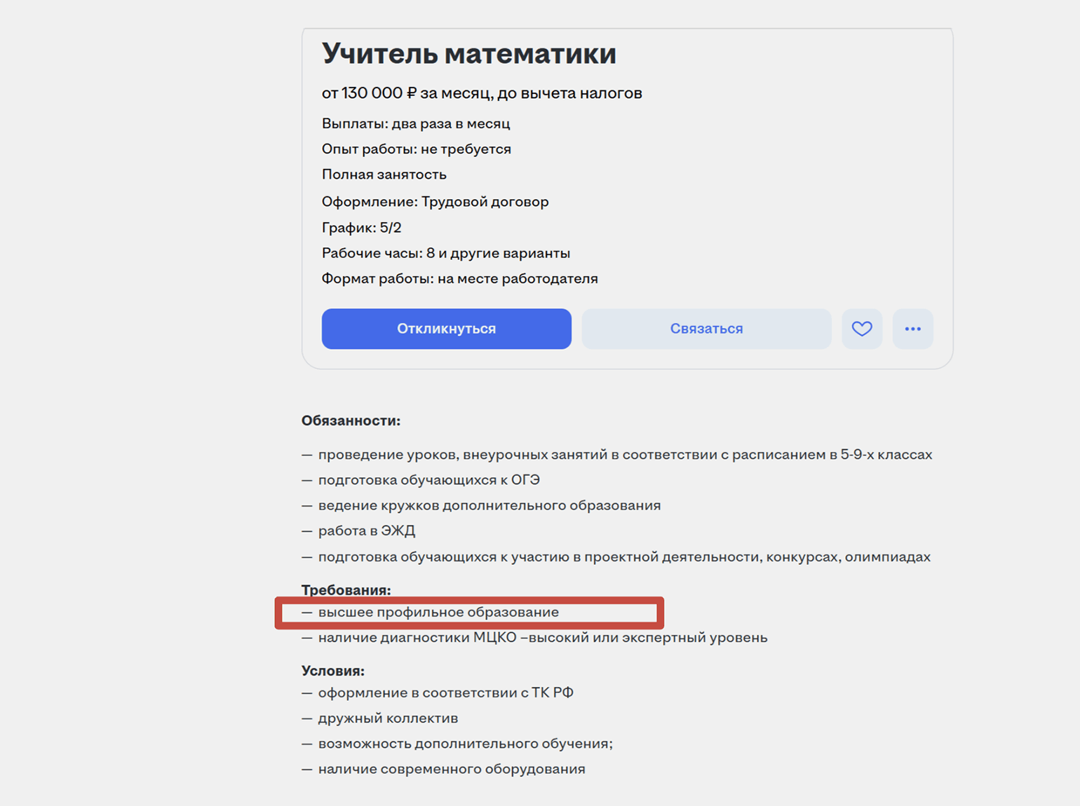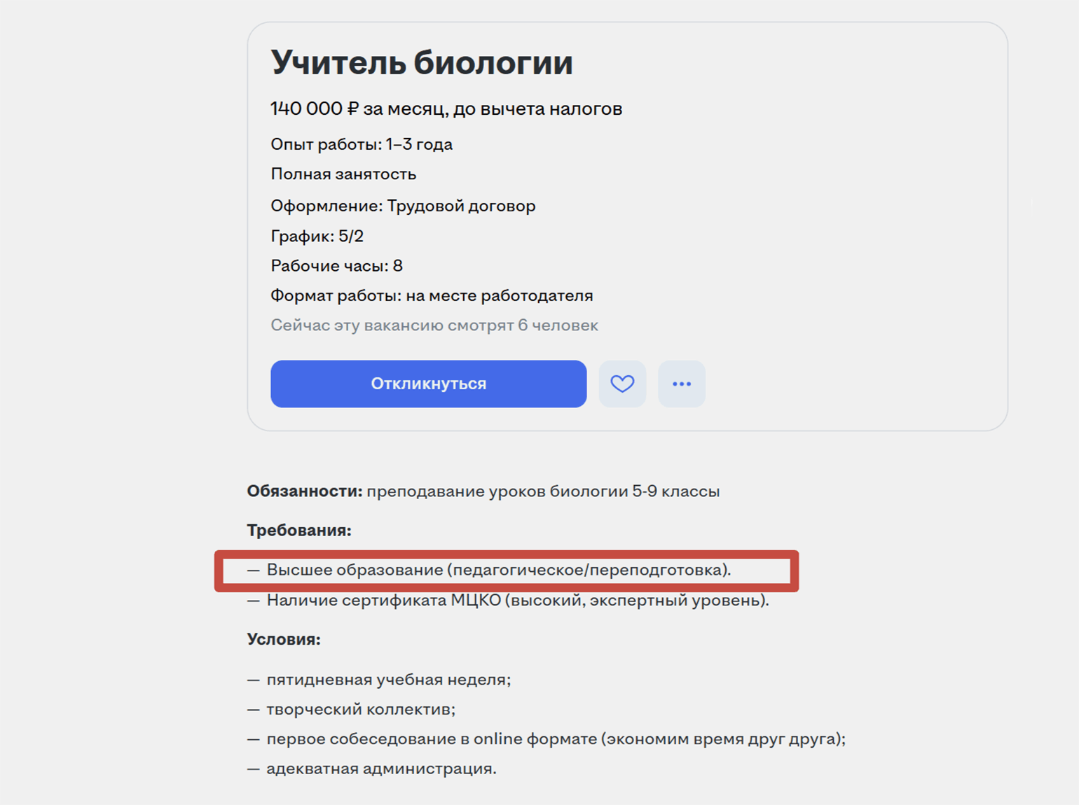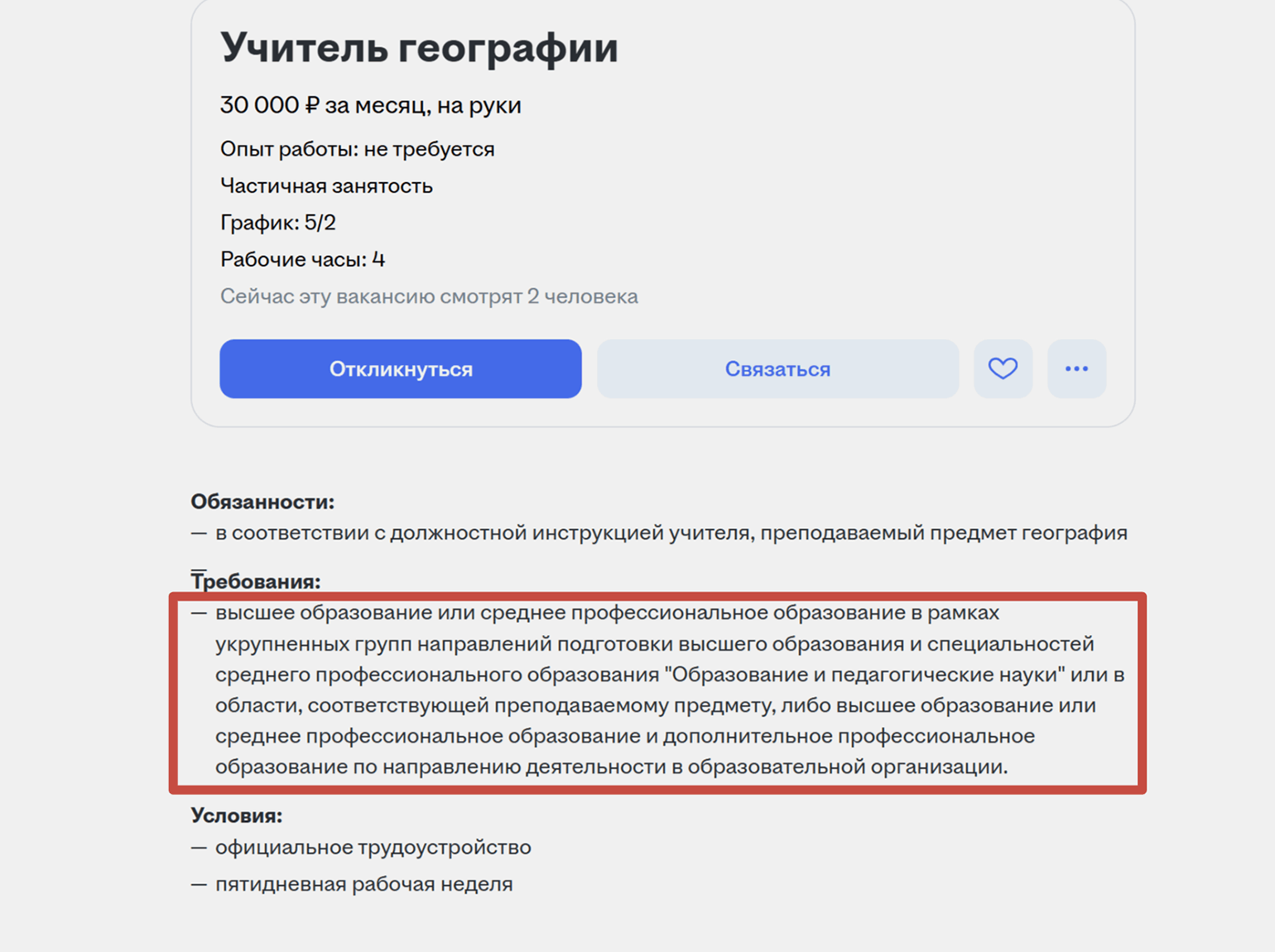 В реальных вакансиях требования к образованию кандидатов формулируют по-разному. В школах, которые считаются престижными, особенно расположенных в регионах, где нет острого дефицита учителей (например, в Москве), как правило, хотят видеть учителей с высшим профильным образованием (педагогическим или в предметной области), а в других будут рады учителям с любым допустимым по закону образованием — и со средним профессиональным, и после курсов.