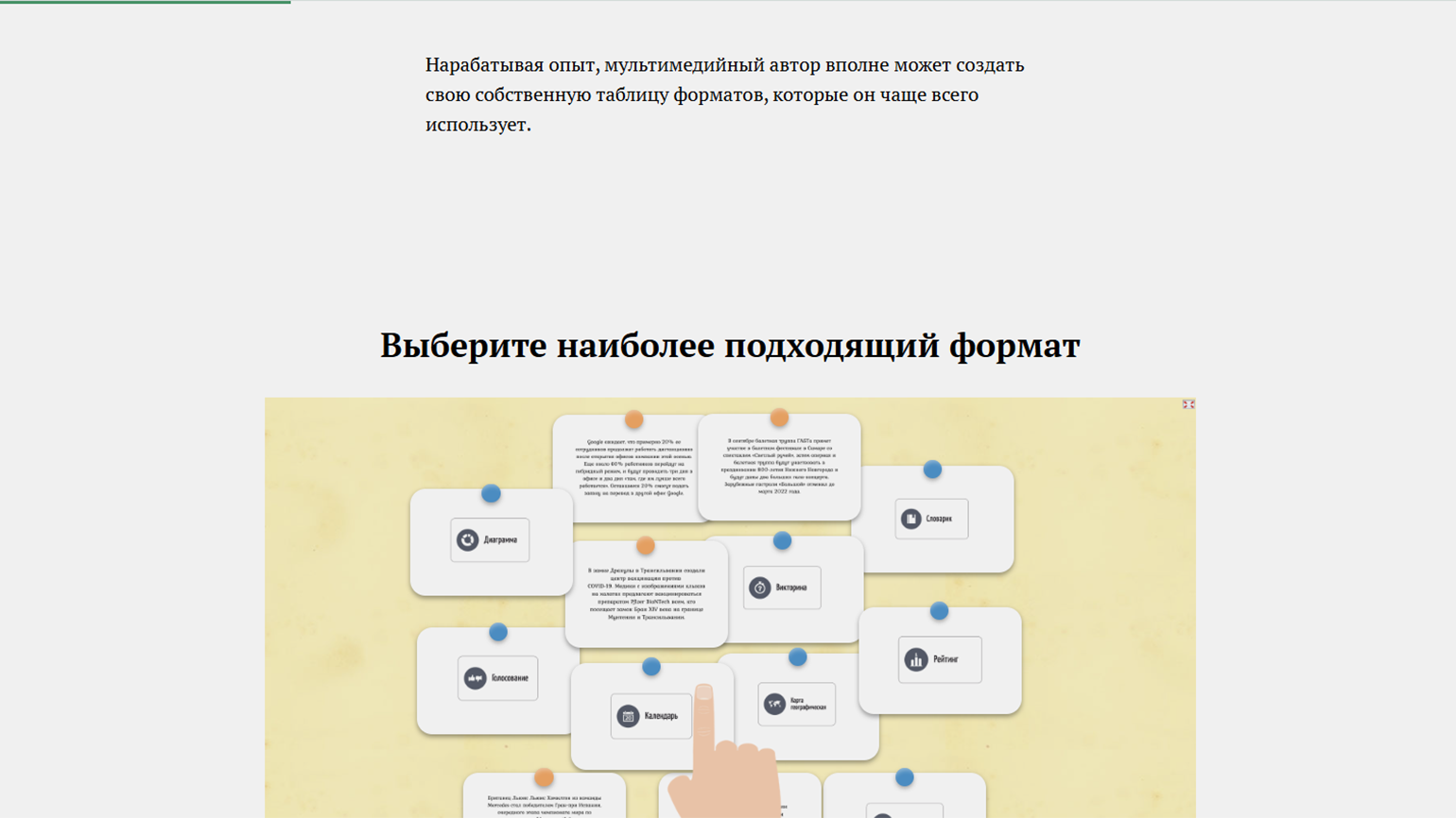 Пытаясь оформить материалы «покрасивее», можно перестараться с украшательством — и тогда оформление лонгрида будет лишь отвлекать студентов от содержания, а не помогать его воспринять, понять и запомнить.