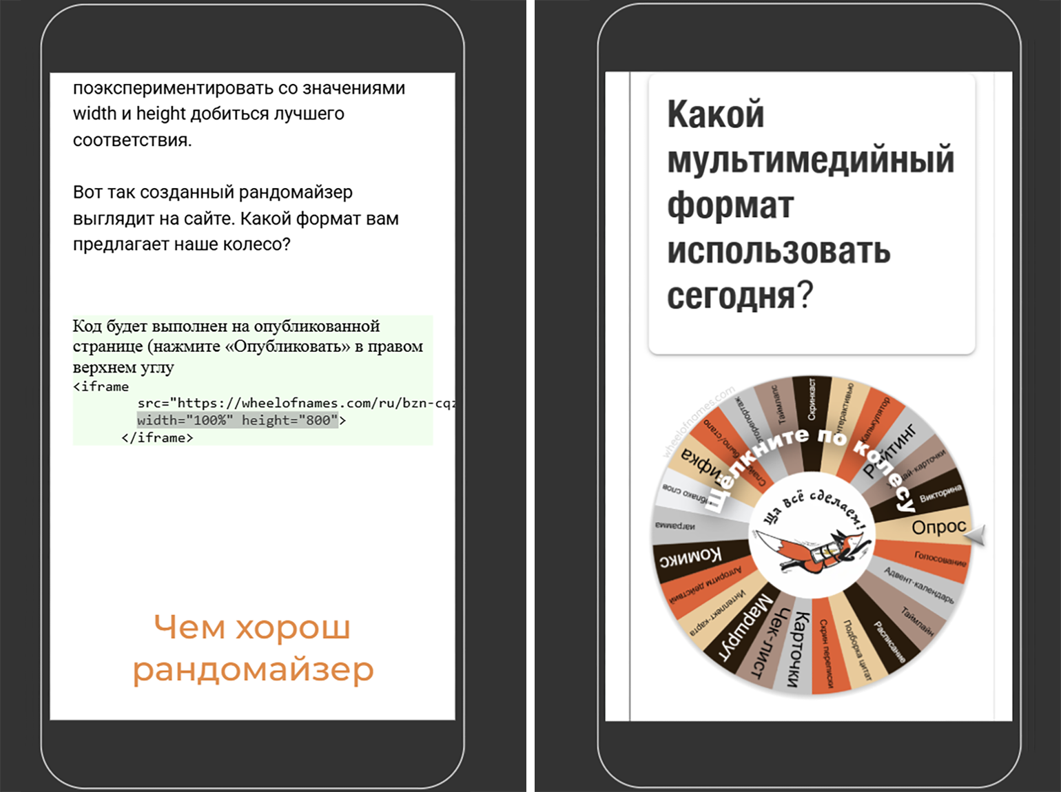 Выбор интерактивных форматов зависит от темы обучения, учебной цели и аудитории, а также от технических особенностей конструктора, который вы используете, и LMS, на которой лонгрид будет размещён. Если они позволяют встраивать контент из внешних сервисов, то выбор становится очень широким — можно, например, использовать упражнения и задания, созданные с помощью LearningApps, Wordwall, «Удобы» и аналогичных инструментов.