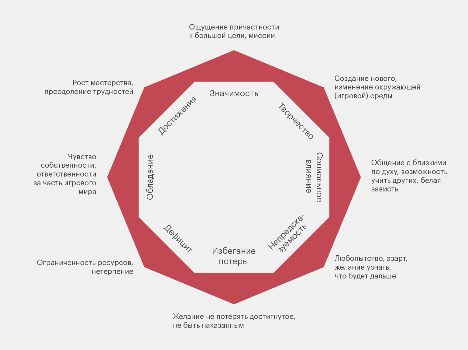 Познакомившись с октализом Ю-Кай Чоу, я поняла, что наконец нашла нужный инструмент. Это восьмиугольная схема драйверов мотивации, которую используют для анализа и разработки геймификационных систем. Каждый угол октализа — один из стимулов, способных подтолкнуть человека к той или иной деятельности:
