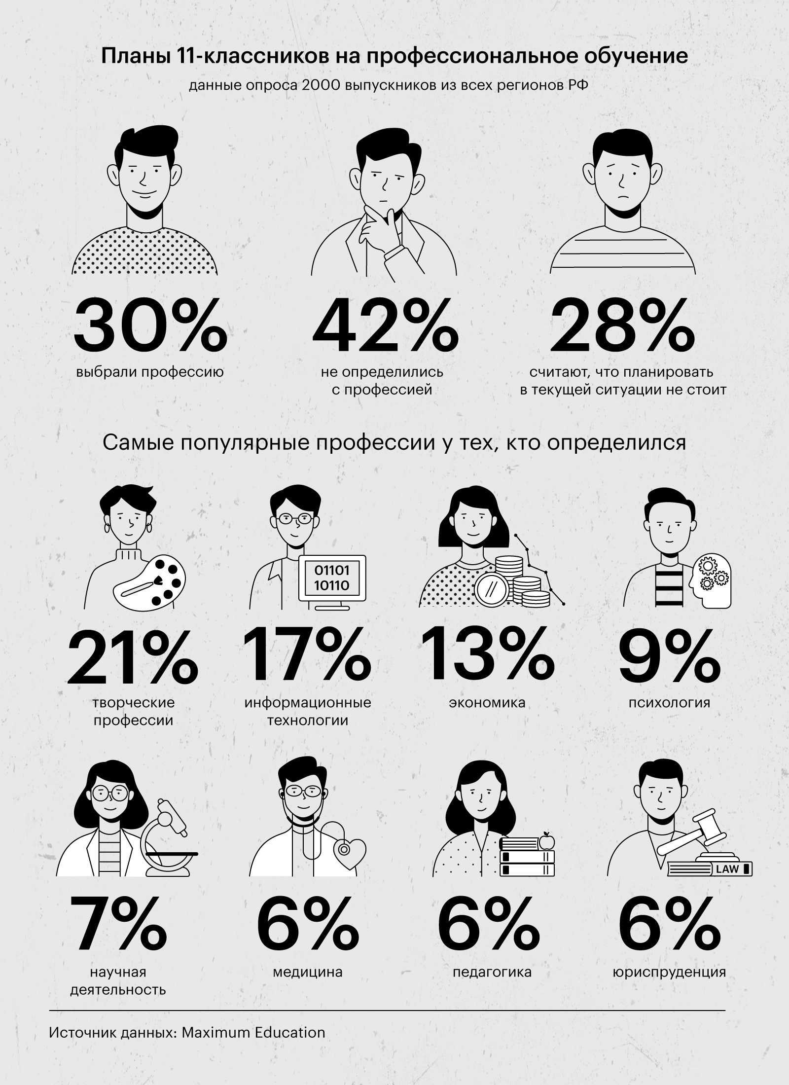 Образовательная компания Maximum Education опросила две тысячи учащихся 11‑х классов из всех регионов России, сообщает РИА «Новости». Почти треть из них считает, что в текущих условиях невозможно планировать выбор будущей профессии. Кстати, год назад похожий опрос той же компании показал, что в апреле 63% одиннадцатиклассников уже выбрали учебное заведение и факультет и ещё 26% респондентов определились с направлением подготовки, но не с университетом. Ни вуз, ни факультет не выбрали тогда лишь 8%.