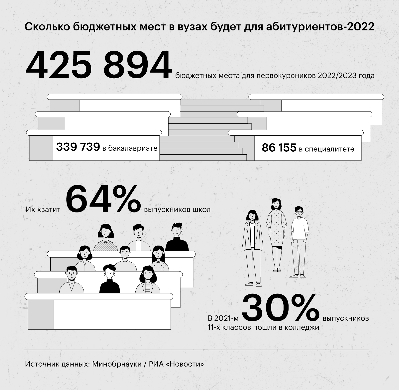 Что касается мест для приёма именно первокурсников (на бакалавриат и специалитет), то их 425 894. Как пояснил РИА «Новости» замминистра науки и высшего образования Дмитрий Афанасьев, их хватит 64% выпусников школ.