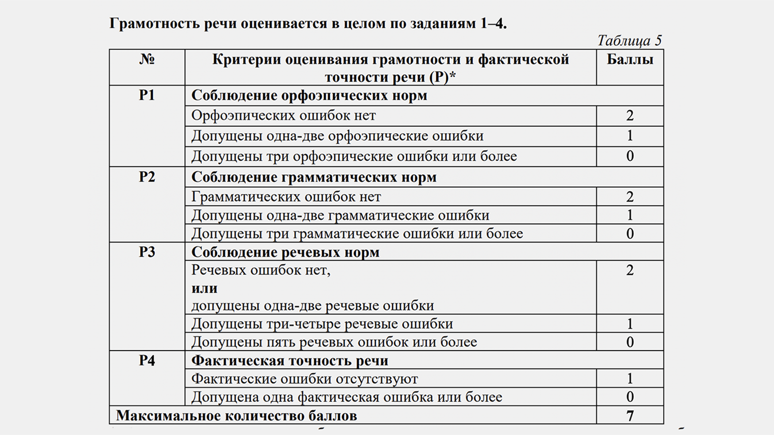 Ещё 7 баллов можно получить за грамотность и фактическую точность речи, которую оценивают в целом по всем четырём заданиям.