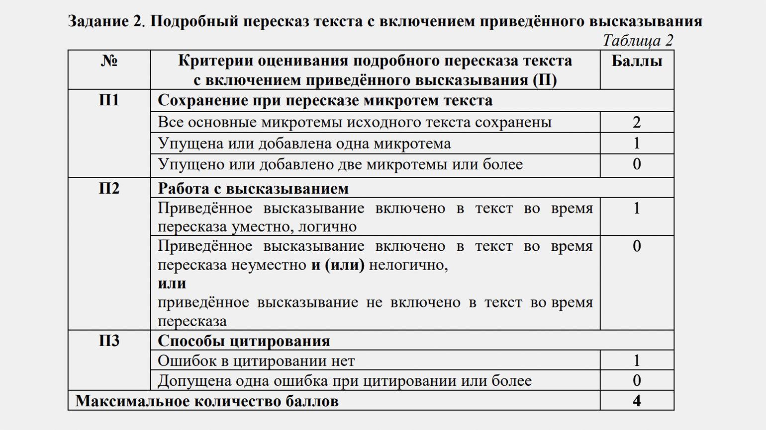 Второе задание обычно даётся ученикам труднее остальных. Пересказ прочитанного текста нужно подготовить за две минуты, при этом нельзя упустить ни одной микротемы. Также в пересказ нужно уместно и логично вставить предложенную цитату.
