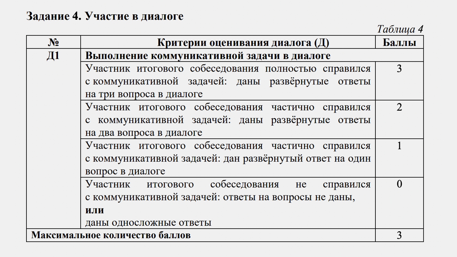 Во время этого задания экзаменатор задаёт три вопроса по теме, выбранной для монолога в третьем задании, а ученик развёрнуто на них отвечает. Экзаменатор может задать вопросы из списка, представленного в контрольно-измерительных материалах (КИМ) для собеседования, или сформулировать свои вопросы по той же теме.