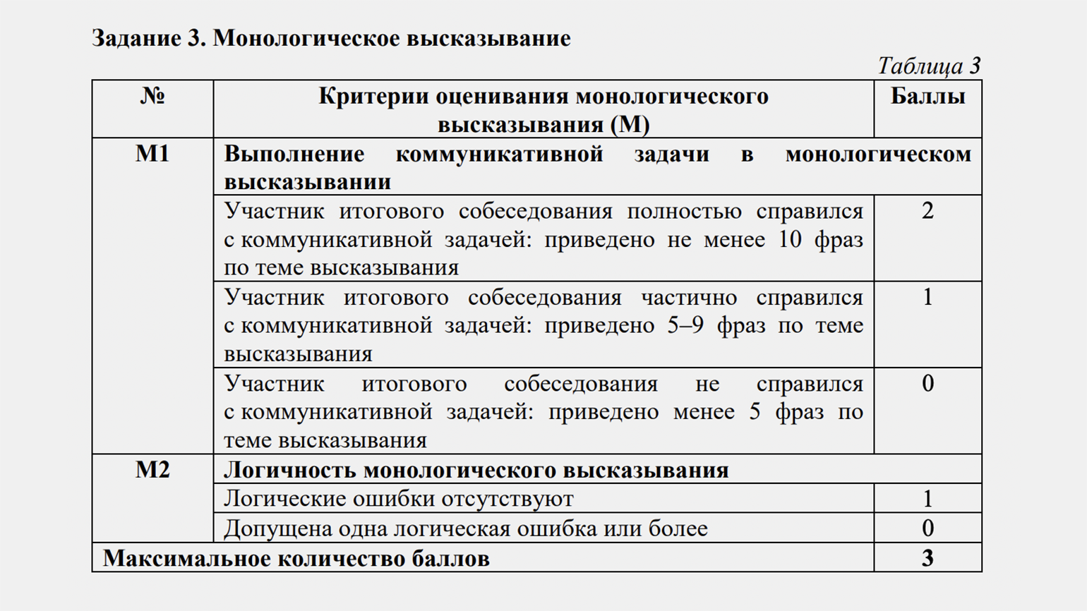 В третьем задании нужно составить монолог, то есть высказаться по одной из трёх тем на выбор. В отличие от пересказа текста, в этом задании нужно выразить собственные мысли. В демоверсии 2026 года предложены такие варианты: