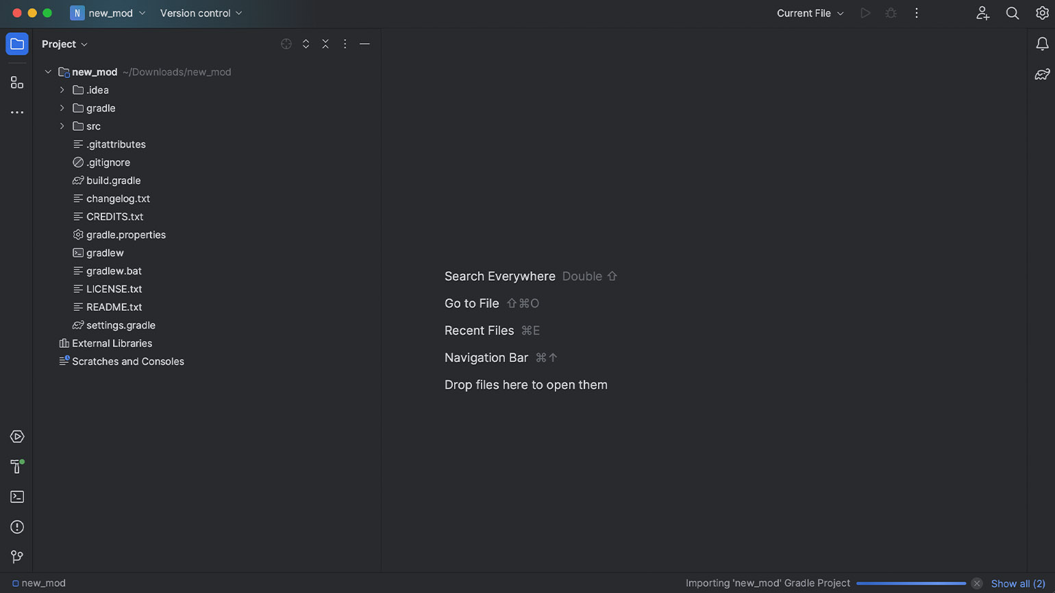 В файловом менеджере выберите папку с модом, которую мы скачали и распаковали на предыдущем шаге. После загрузки проекта слева от редактора появится панель с деревом проекта: в ней отображаются все папки и файлы мода, включая директории src, java и resources.
