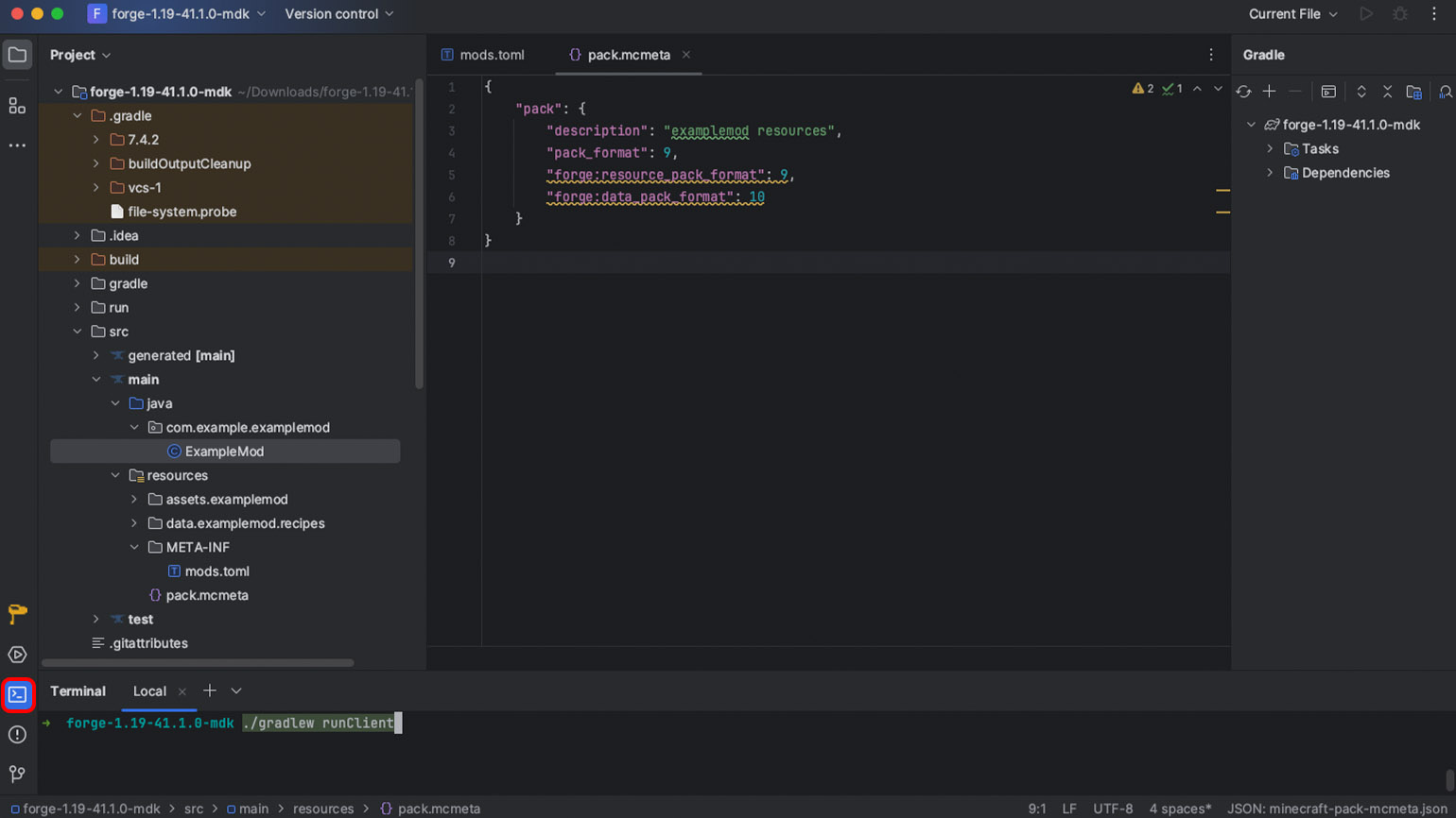Ещё в папке src/main/resources должен находиться файл pack.mcmeta — в нём хранятся метаданные ресурспака, без которых мод не запустится. Если файла нет, создайте его и добавьте следующий код: