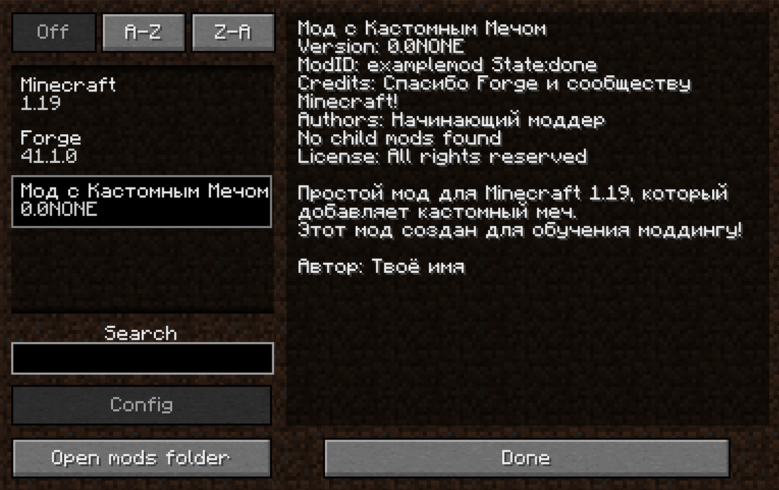 Если на каком-то этапе у вас возникли трудности, вы можете скачать готовый мод с нашего диска и протестировать JAR-файл на своём компьютере. Но для корректной работы мода нужен Minecraft 1.19 с установленным Forge. В других версиях игры мод может не запускаться или работать с ошибками из-за несовместимости API.