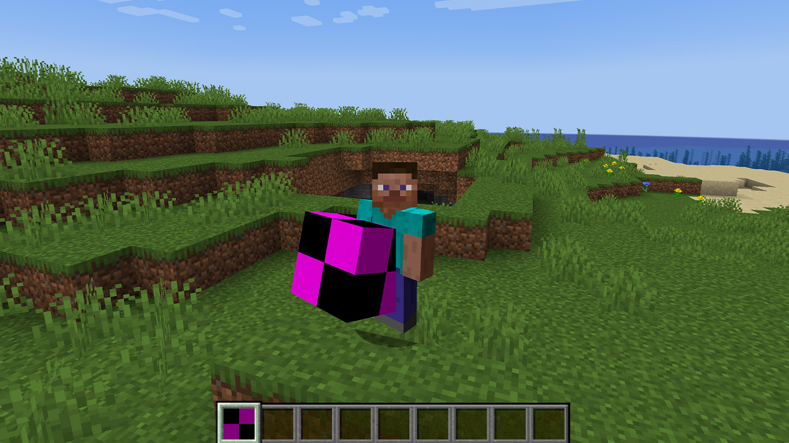 Наш меч может наносить урон, и его можно скрафтить, но в игре он выглядит как странный фиолетово-чёрный набор пикселей. Это стандартная заглушка Minecraft для отсутствующих текстур: