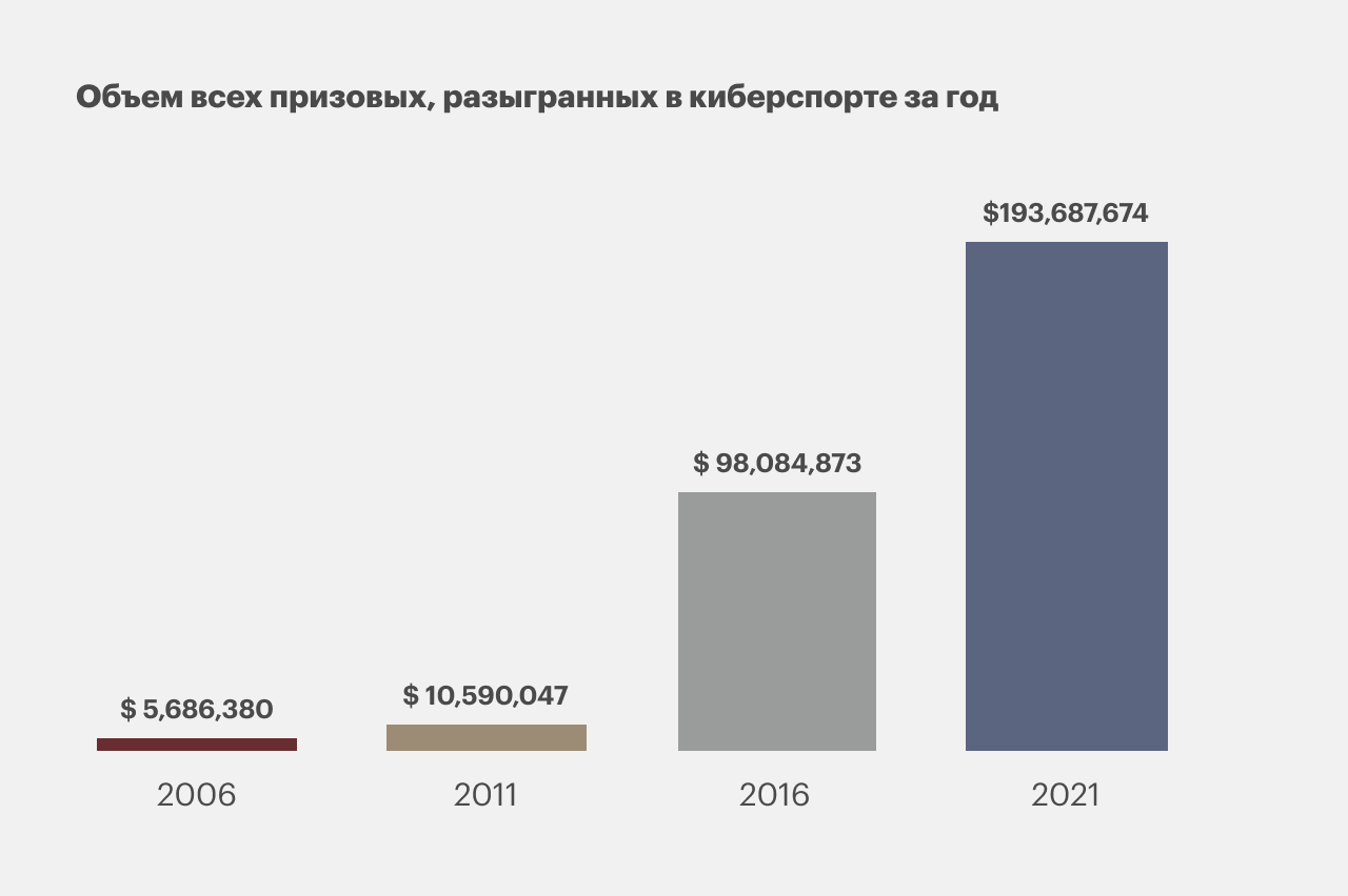 Понимание этого привлекло в киберспорт большие деньги — призовые на крупных турнирах и зарплаты киберспортсменов постоянно растут. В 2021 году по всему миру прошли сотни чемпионатов по видеоиграм, на которых было разыграно почти 200 млн долларов. Это в 20 раз больше, чем в 2011-м, и в два раза больше, чем в 2016-м.