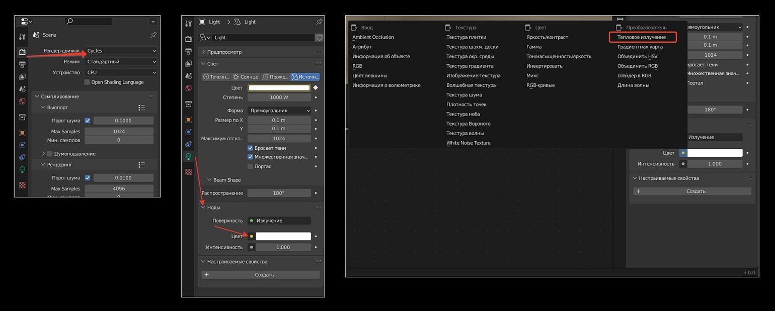 Чтобы активировать шкалу Кельвина в Blender — достаточно подключить нод Тепловое излучение (Blackbody) в настройках.