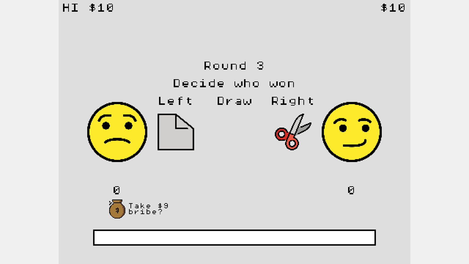 В чём фишка игры. Два игрока играют в «Камень, ножницы, бумага», а вы, как рефери, объявляете победителя либо ничью. После пары раундов стороны начнут предлагать вам взятки, чтобы вы рассудили игру в их пользу. Если брать деньги слишком часто, вас лишат должности, — но не брать вы тоже не можете, потому что за каждые пять раундов вам нужно собрать определённую сумму, а честное судейство больших доходов не приносит.